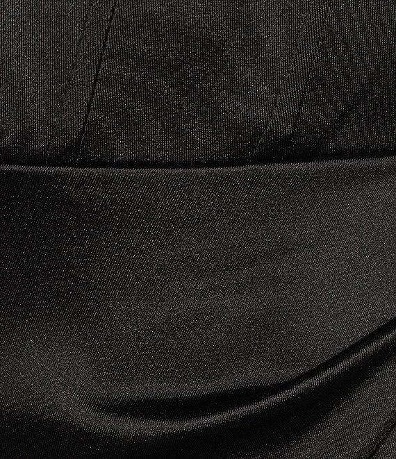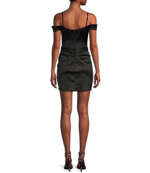 From B. Darlin, this dress features:Drape necklineOff-the-shoulder strapsBustier bodicePleatedSide slit and faux wrap detailingSheath silhouetteZip back closureMini lengthPolyester/spandexHand washImported.