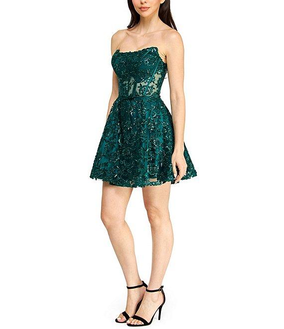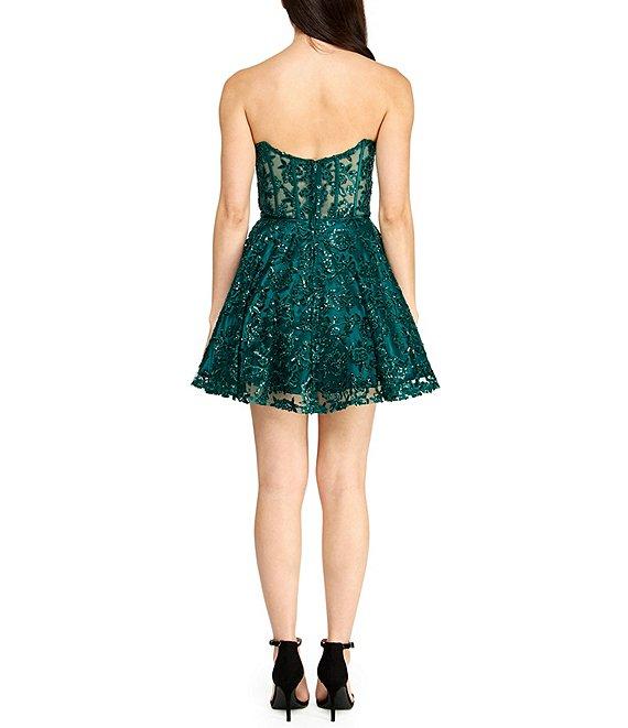 B. Darlin Embroidered Sequined Mesh Strapless Illusion Bustier Party Dress