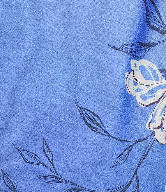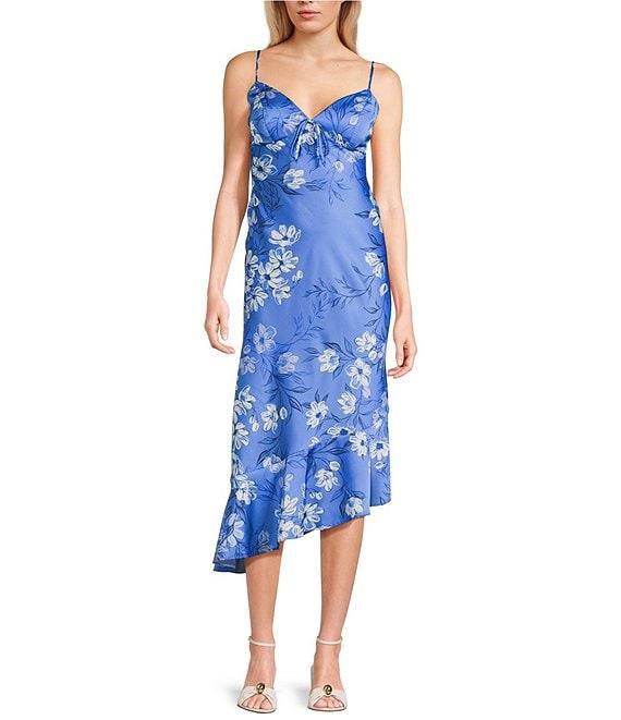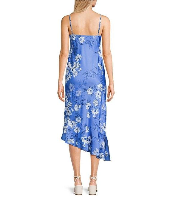 From B. Darlin, this dress features: All-over floral print Tie-accented V-neckline Sleeveless Adjustable spaghetti straps Midi skirt with asymmetrical ruffled hem Pullover styling High, 46" length Low, 55" length Self of polyester/spandex; lining of polyester Machine wash/line dry Imported.