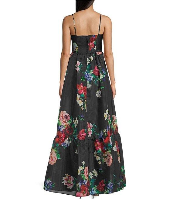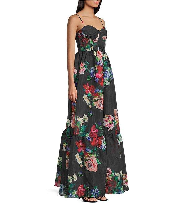 From B. Darlin, this dress features: Floral printed fabric Pleated sweetheart neckline Sleeveless Adjustable spaghetti straps Bustier corset bodice Center back smocking Zip back closure Ruffled hem 63" length Self and lining of polyester Hand wash/line dry Imported.