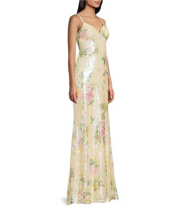 From B. Darlin, this dress features: Floral printed sequin dress V-neckline Sleeveless Double spaghetti straps Mermaid skirt Zip and lace up back closure 63" length Polyester/spandex; lined Spot clean Imported.