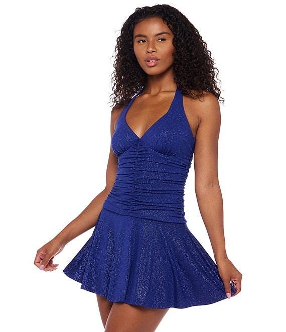 From B. Darlin, this dress features: Glitter fabrication Halter V-neckline Shirred, fitted bodice Drop waist Tie-back closure 34" high point shoulder length Polyester/spandex "ITY fabric; lined Hand wash/lay flat to dry Imported.