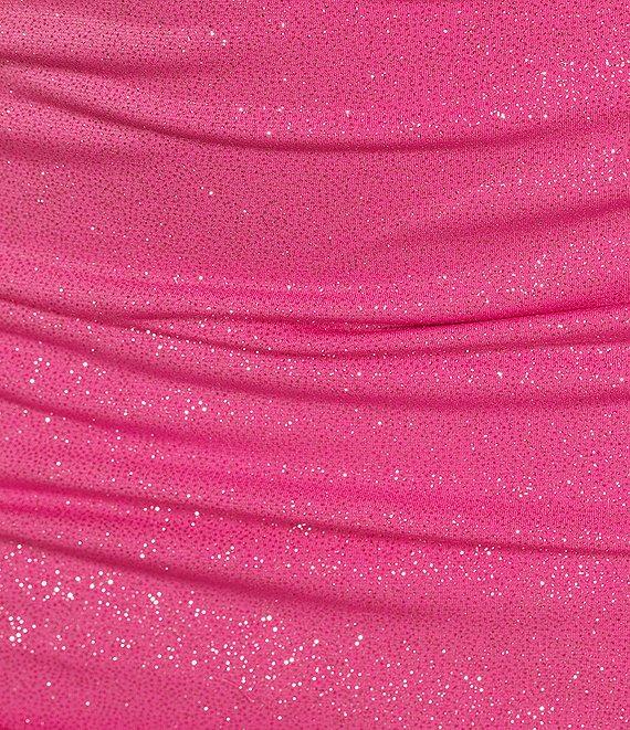 From B. Darlin, this dress features: Allover glitter Scoop neckline Sleeveless Pull-on styling Ruched bodycon silhouette Polyester/spandex Hand wash Imported.