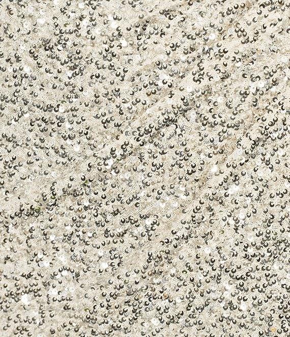 From B. Darlin, this dress features: Glitter sequin fabric Deep V-neckline Sleeveless Adjustable spaghetti straps Side shirring Faux-wrap silhouette Zippered back 34" length Self of polyester/spandex; contrast and lining of polyester Hand wash/line dry Imported.