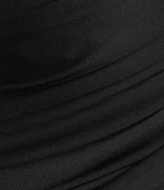 From B. Darlin Plus, this ballgown features: Drape, off the shoulder neckline Bustier bodice Spaghetti straps Faux wrap skirt Front slit Approx. 64" length Polyester/spandex; lined Hand wash/line dry Imported.
