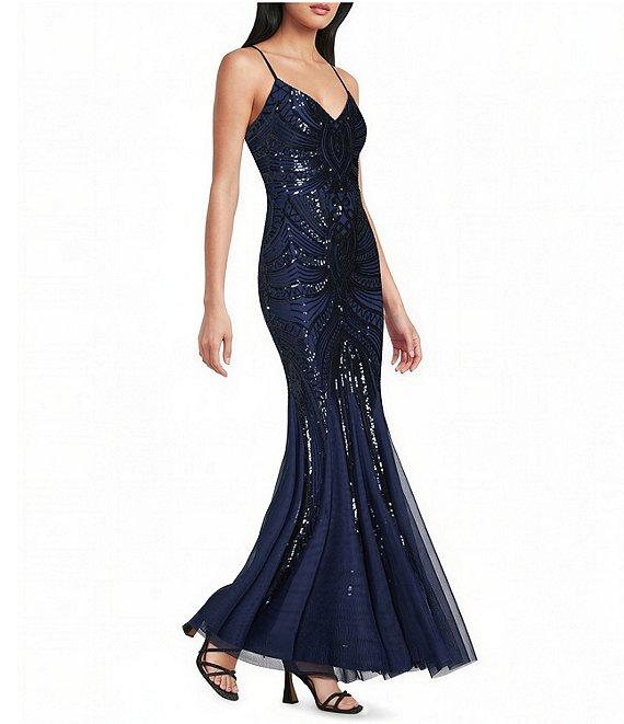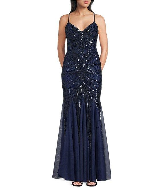 B. Darlin Sequin Sheer/Nude Pattern V-Neck Spaghetti Strap Lace Up Back Dress