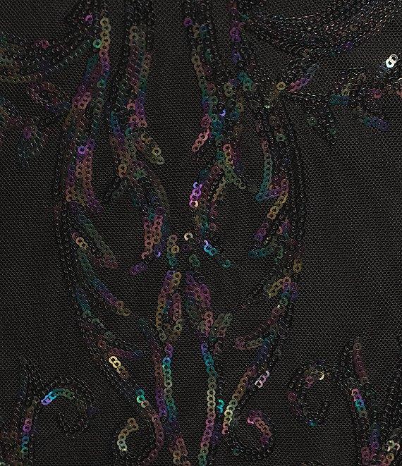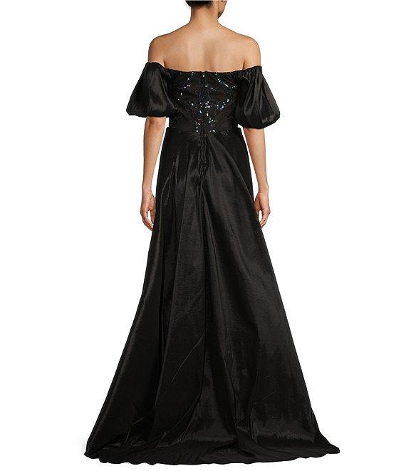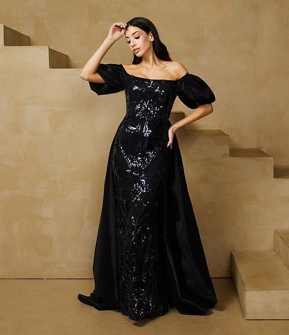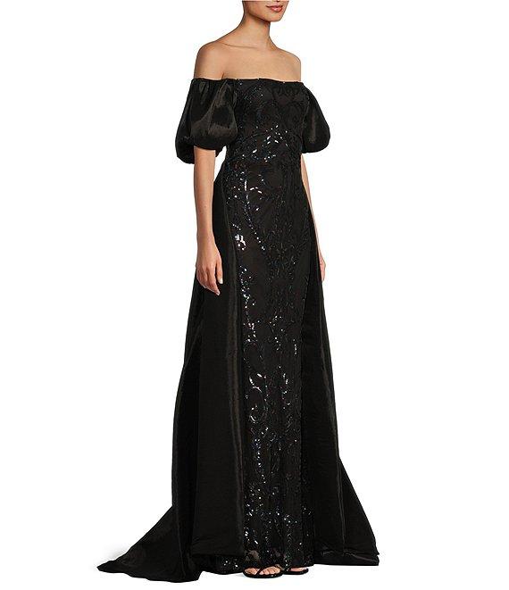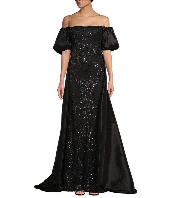 From B. Darlin, this dress features: Mesh with sequins patterns Off-the-shoulder neckline Puff short sleeves Off-the-shoulder Back zipper closure A-line Approx. 64"inseam Polyester/spandex Hand wash/line dry Imported.