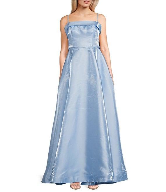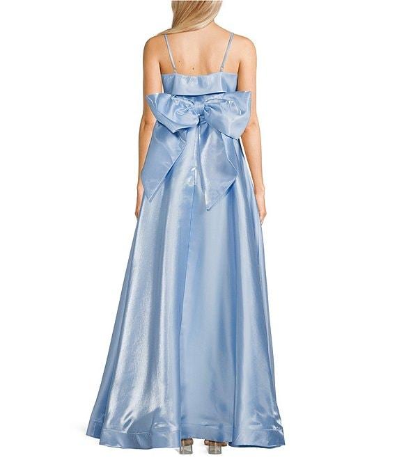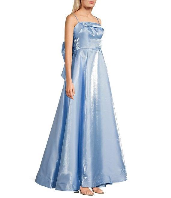 From B. Darlin, this dress features: Shimmer Mikado fabric Square neck Sleeveless Adjustable spaghetti straps Side zipper closure Slit and back bow A-line Approx. 63"inseam Polyester Spot clean only Imported.