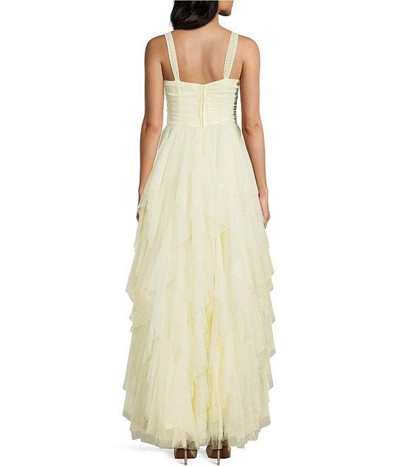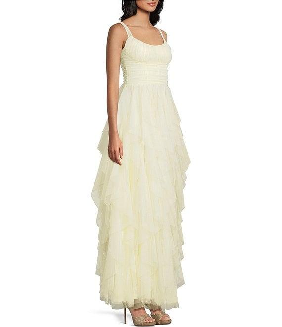 From B. Darlin, this dress features: Scoop neckline Sleeveless Wide shoulder straps Long, cascading ruffled skirt with front slit Zip back closure 64" length Self and lining of polyester Spot clean Imported.