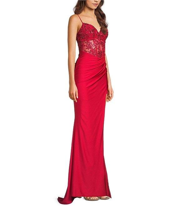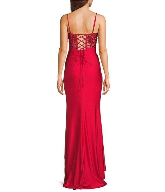 B. Darlin Sleeveless Sweetheart Neck Spaghetti Strap Illusion Lace Corset Side Slit Dress