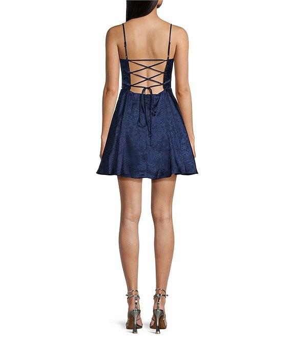 From B. Darlin, this skirt features: Sweetheart neckline Sleeveless Adjustable spaghetti straps Pleated skirt Lace up back Back pockets Zipper back closure Lined Approx. 34.5" Polyester/spandex Hand wash/line dry Imported.