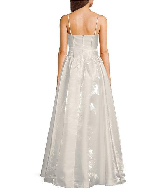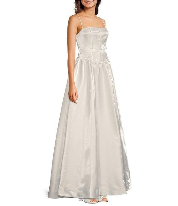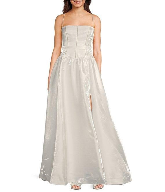From B. Darlin, this dress features: Square neckline Sleeveless Adjustable spaghetti straps Ladder lace detail Drop waist Front slit Zip back closure HPS 63" length Polyester Machine wash cold/line dry Imported.