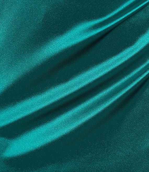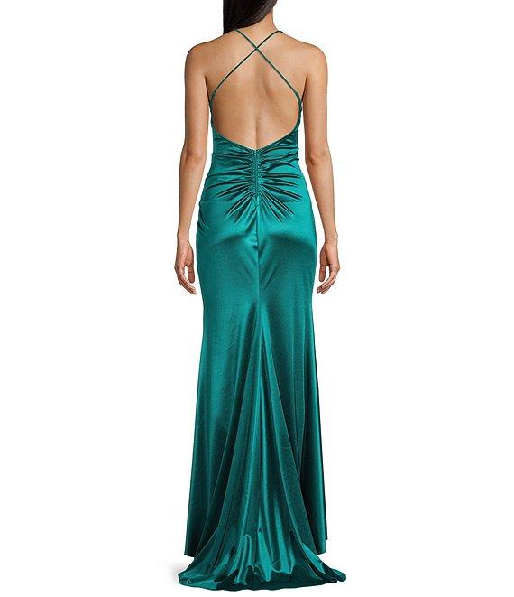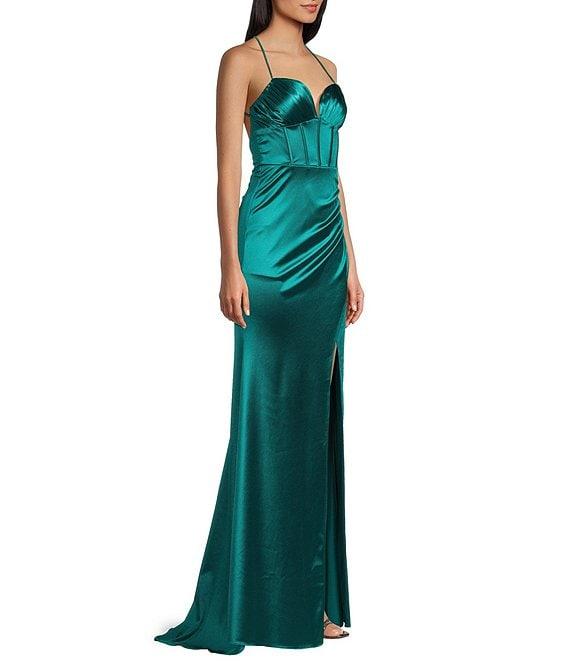 From B. Darlin this dress features: V-neck Sleeveless Adjustable spaghetti straps Corset bodice Pleats Side slit Zip back closure HPS 64" length Polyester/spandex Machine wash/dry flat Imported.