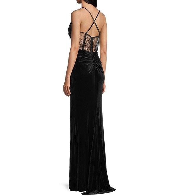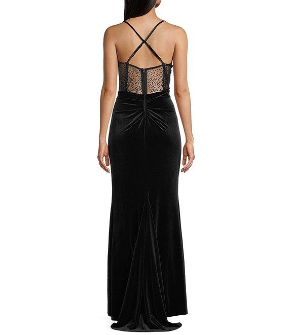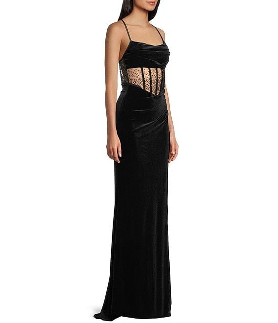 From B. Darlin, this gown features: Cowl neckline Sleeveless Adjustable spaghetti straps Illusion corset bodice Front side slit Lace-up back Zip back closure 64" length Self of polyester/spandex; lining of polyester Hand wash/lay flat to dry Imported.