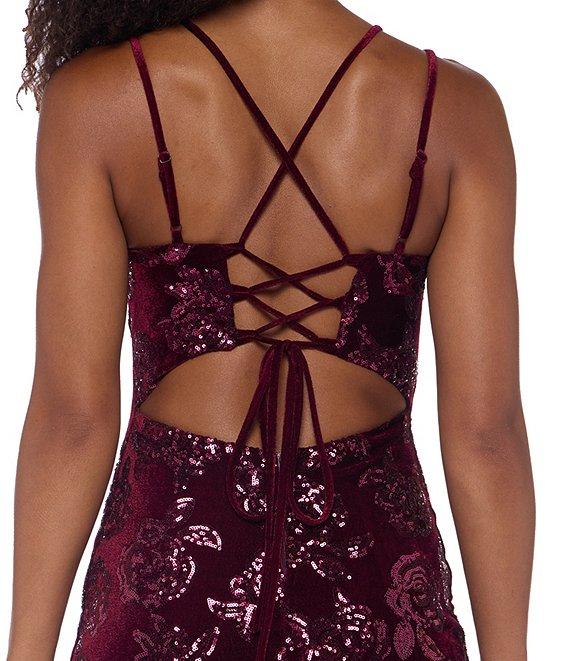 B. Darlin Velvet Floral Patterned Sequin V-Neck Criss Cross Lace Up Back Bodycon Dress