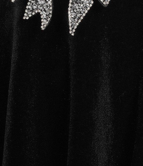 From B. Darlin, this dress features: Velvet fabric Strapless neckline Three contrasting bow accents on the bodice Layered, ruffled hem Zip-back closure 34" length Polyester/spandex; lined Hand wash/line dry Imported.