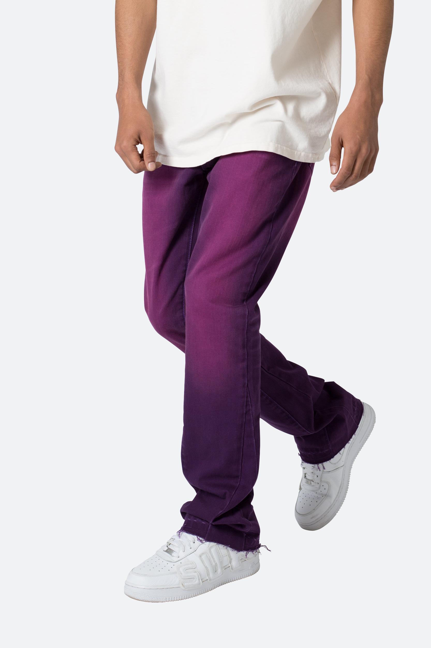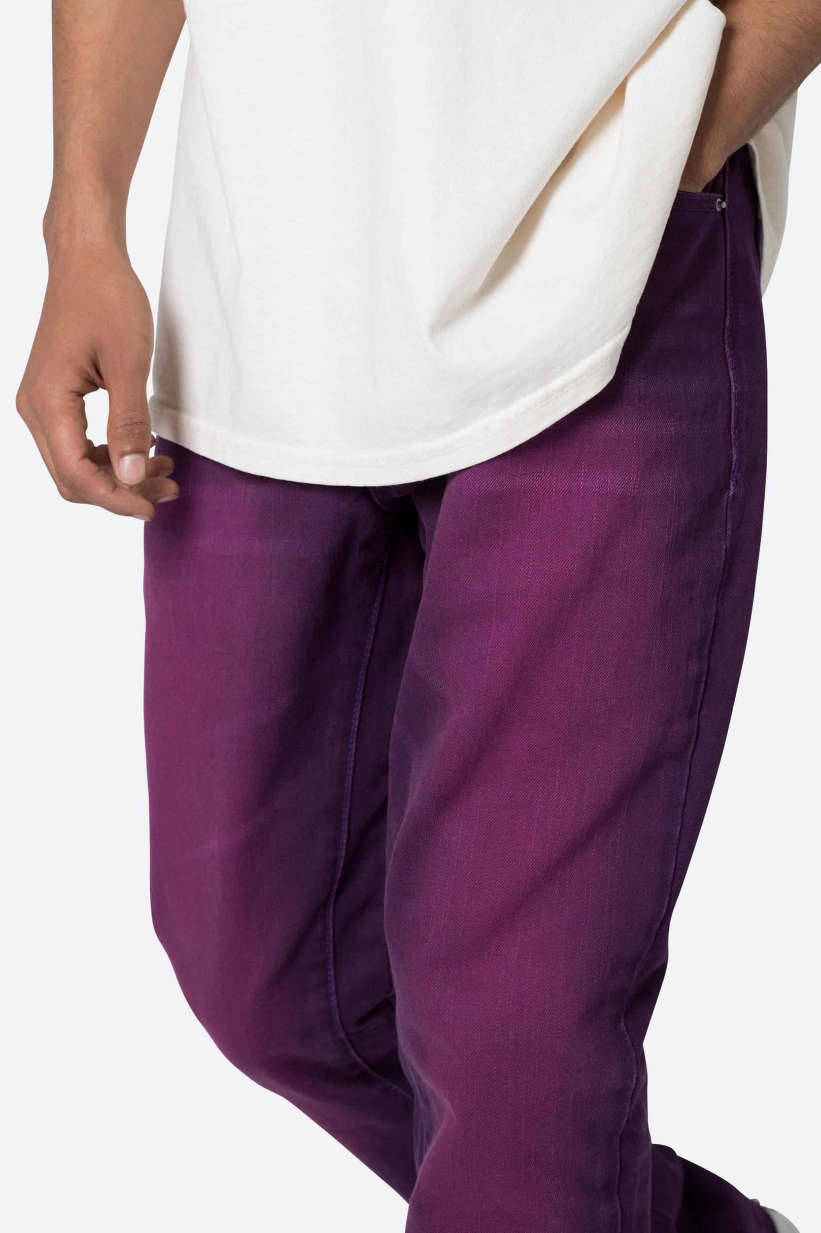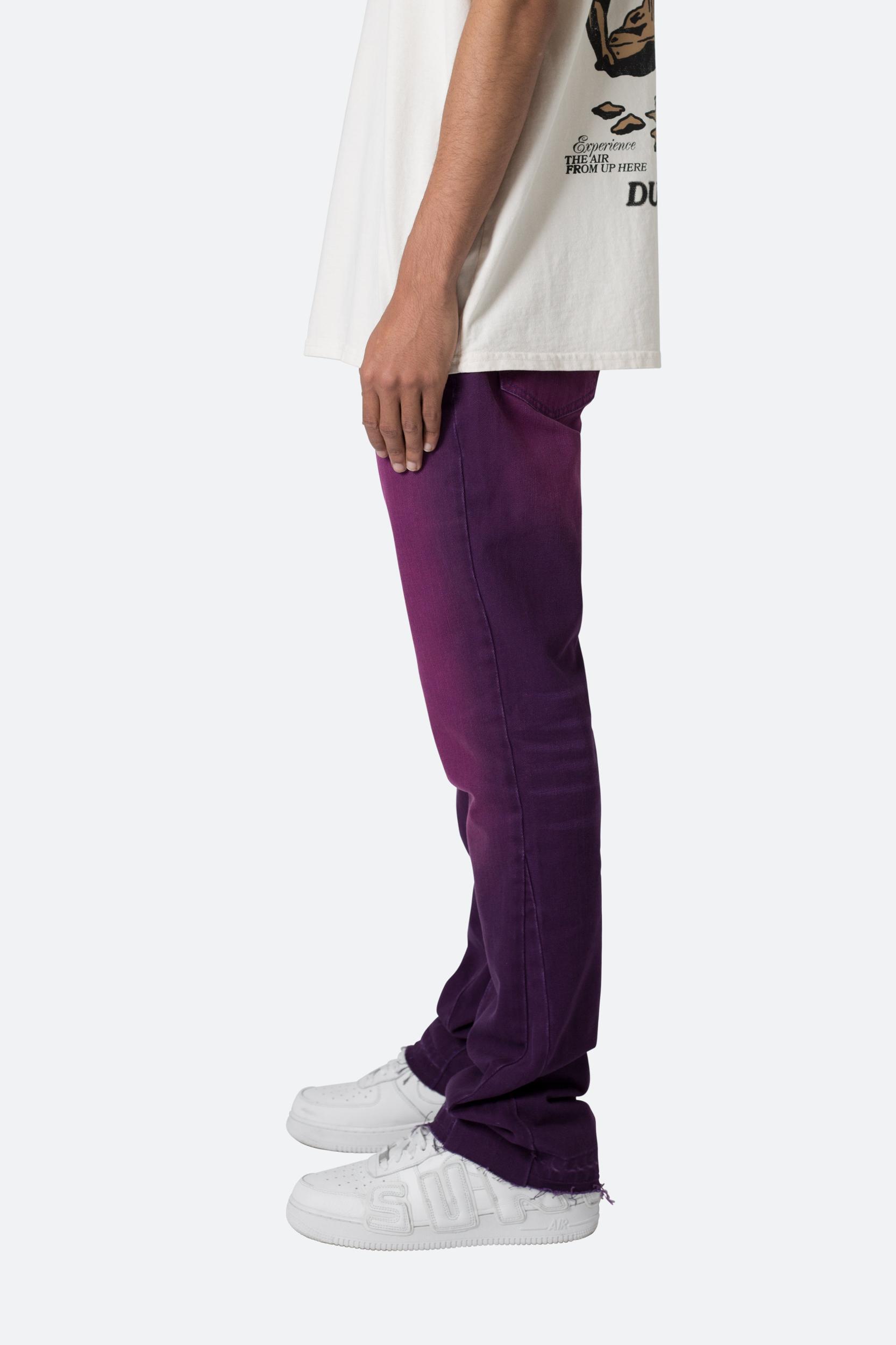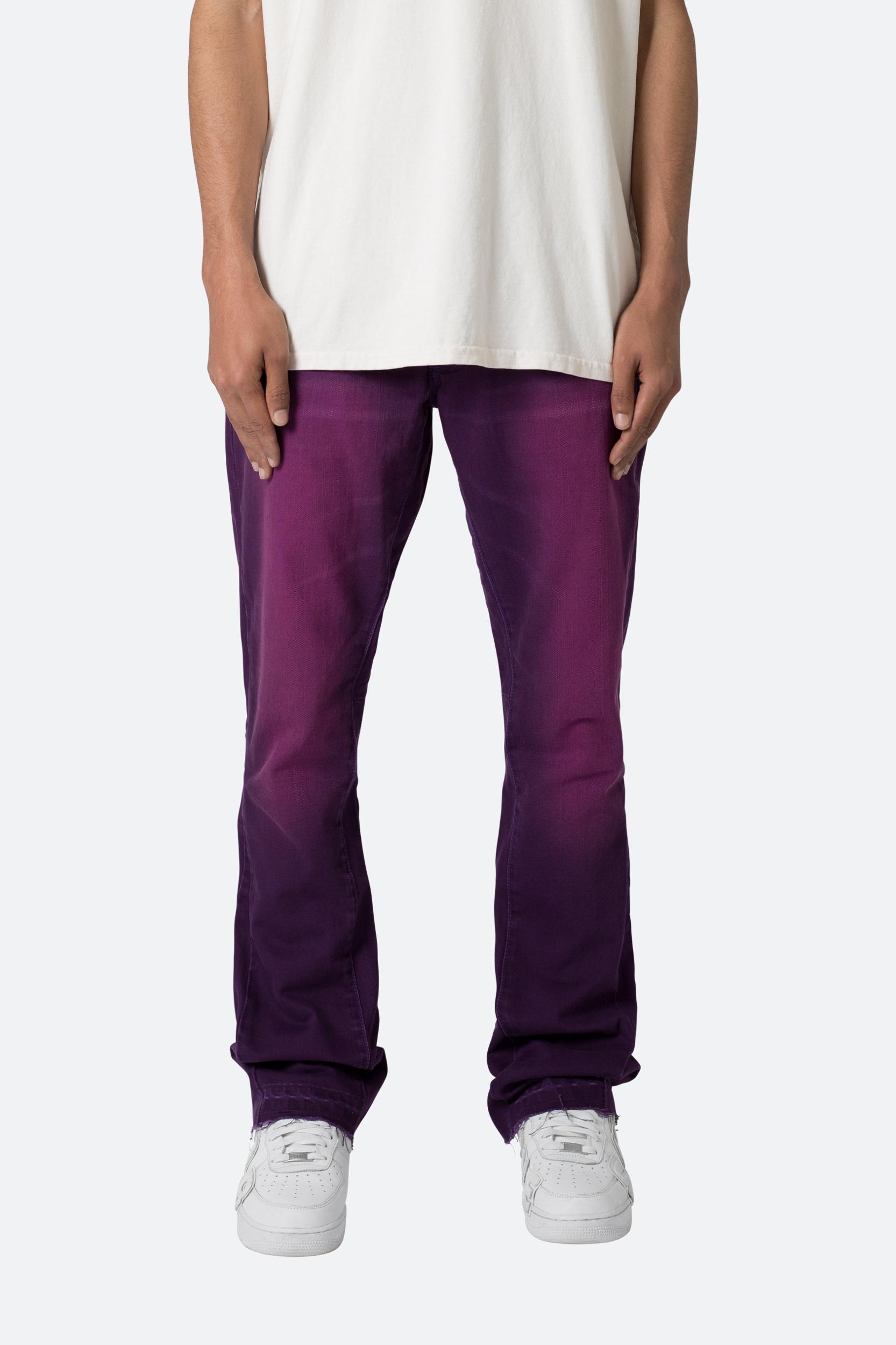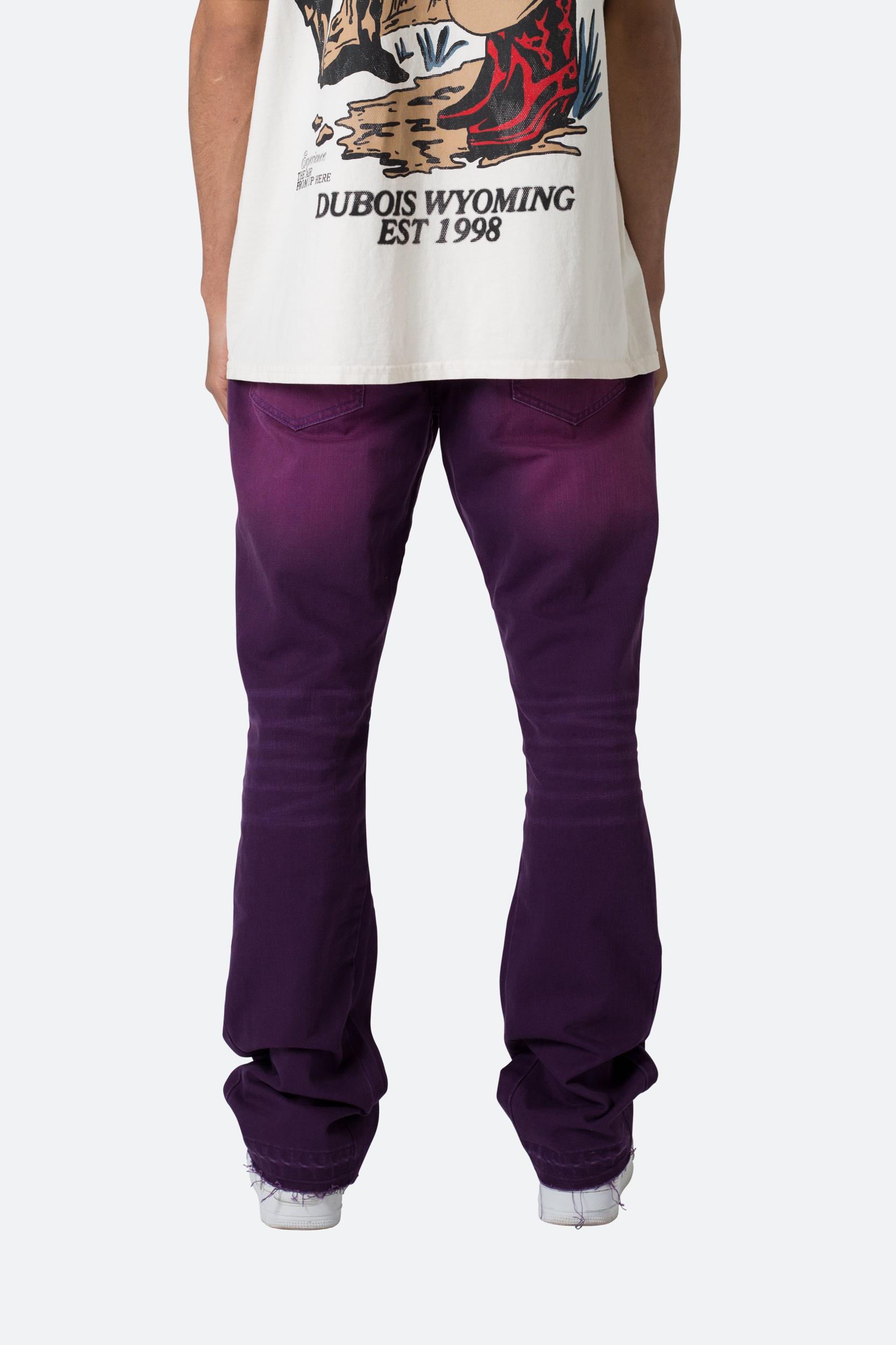 the B512 Flare Denim are designed with our new B fit, which is slim through the thigh and features a slight flare at the leg opening and is constructed from a purple washed black denim, panelling at the inseam and outseam from a self fabric for a slight flare and finished with a deconstructed hem. details flare at leg