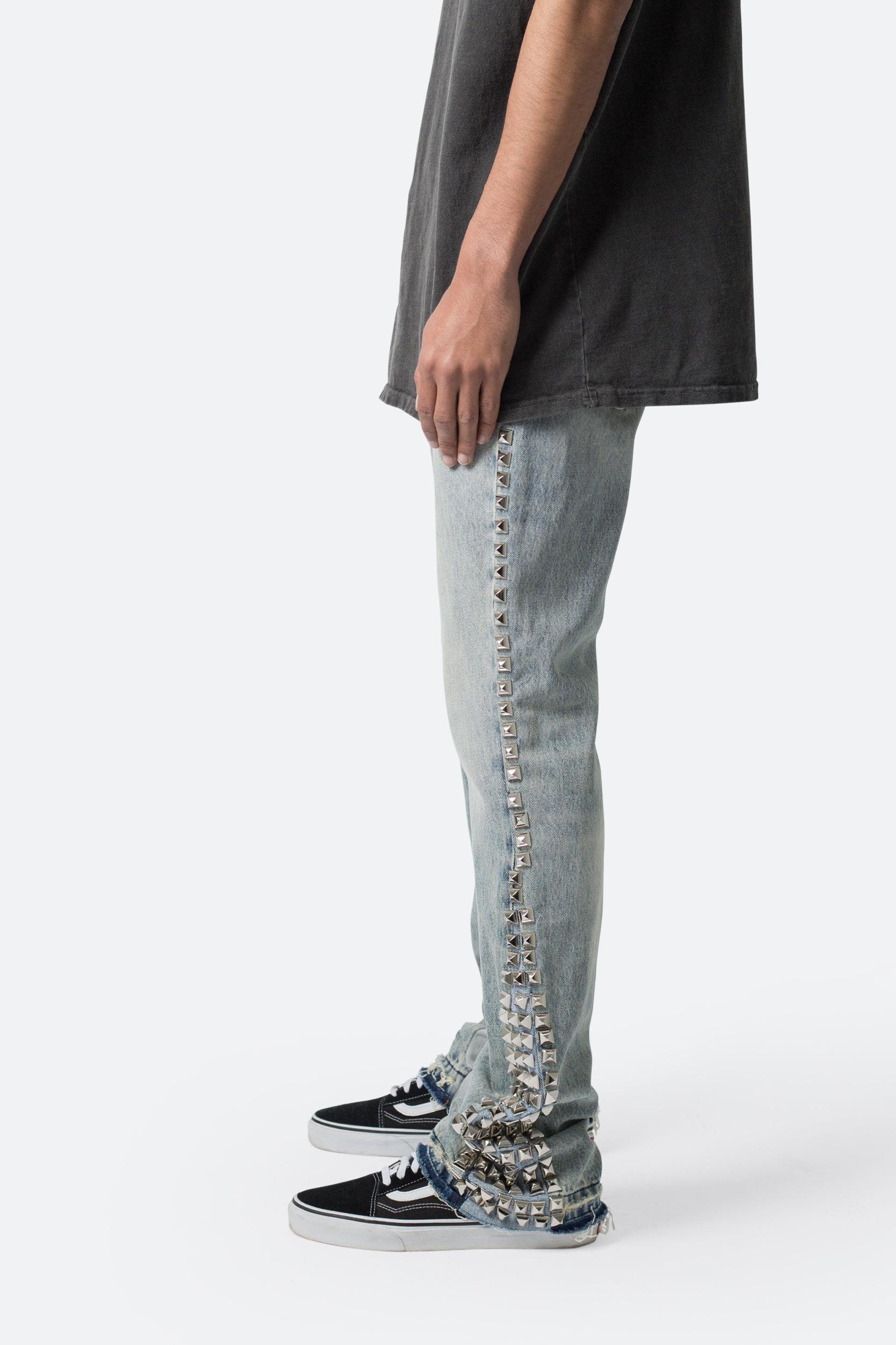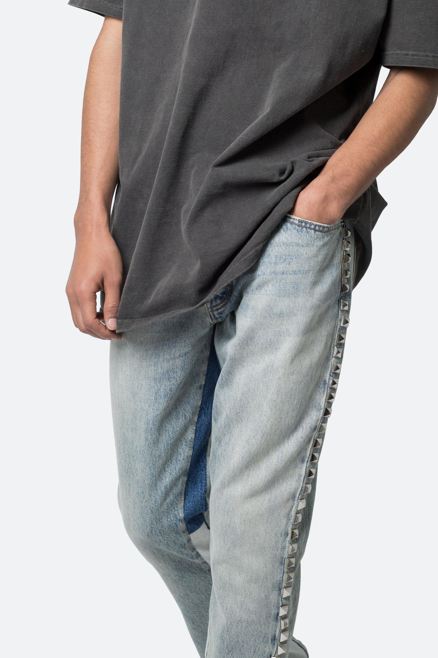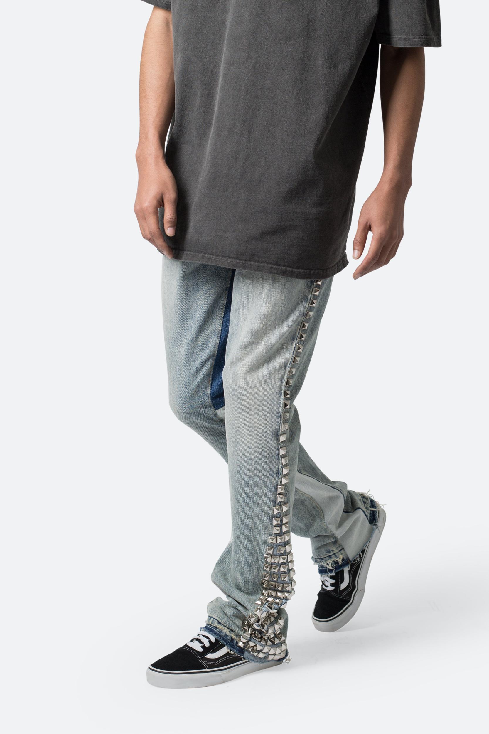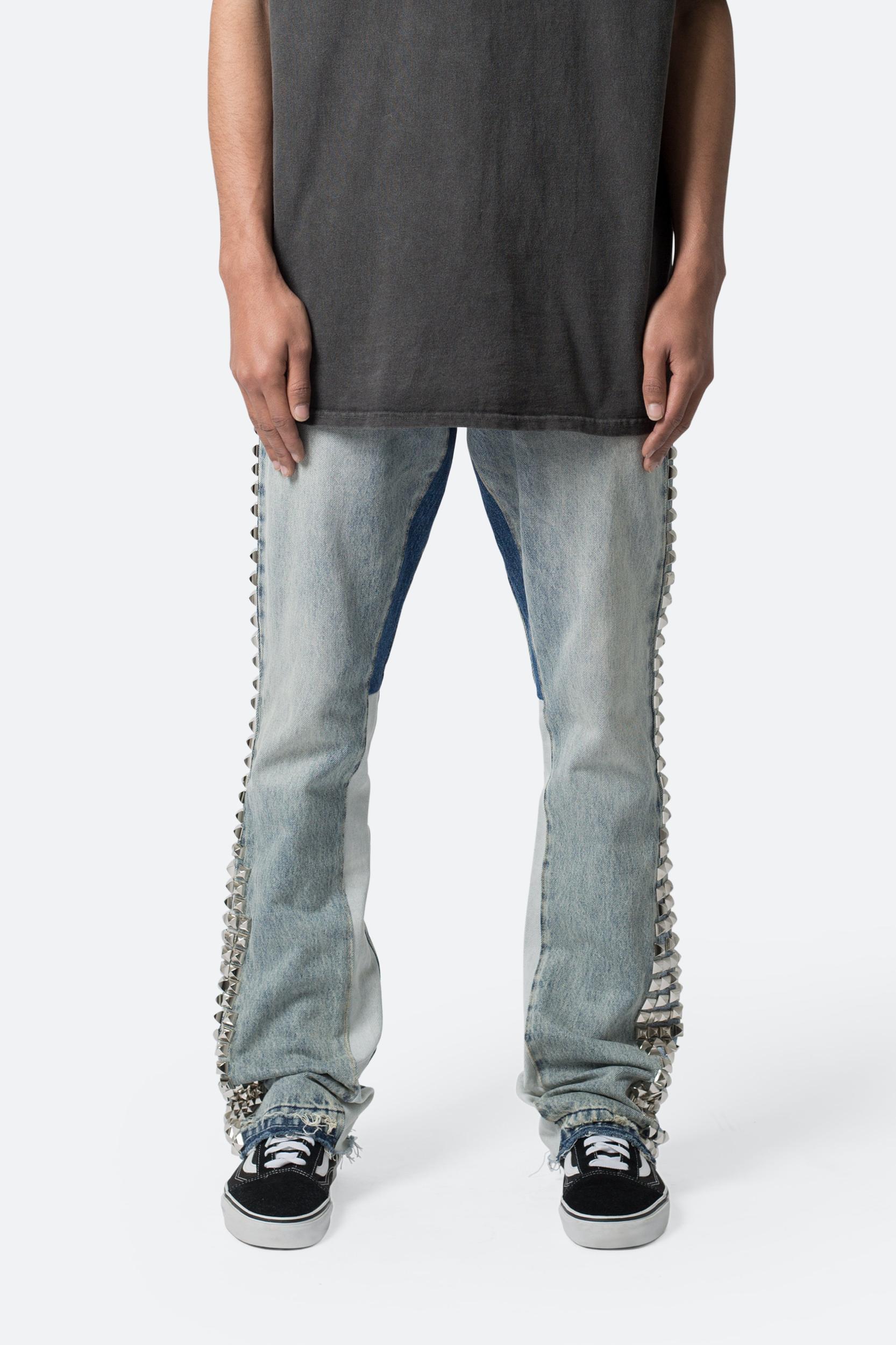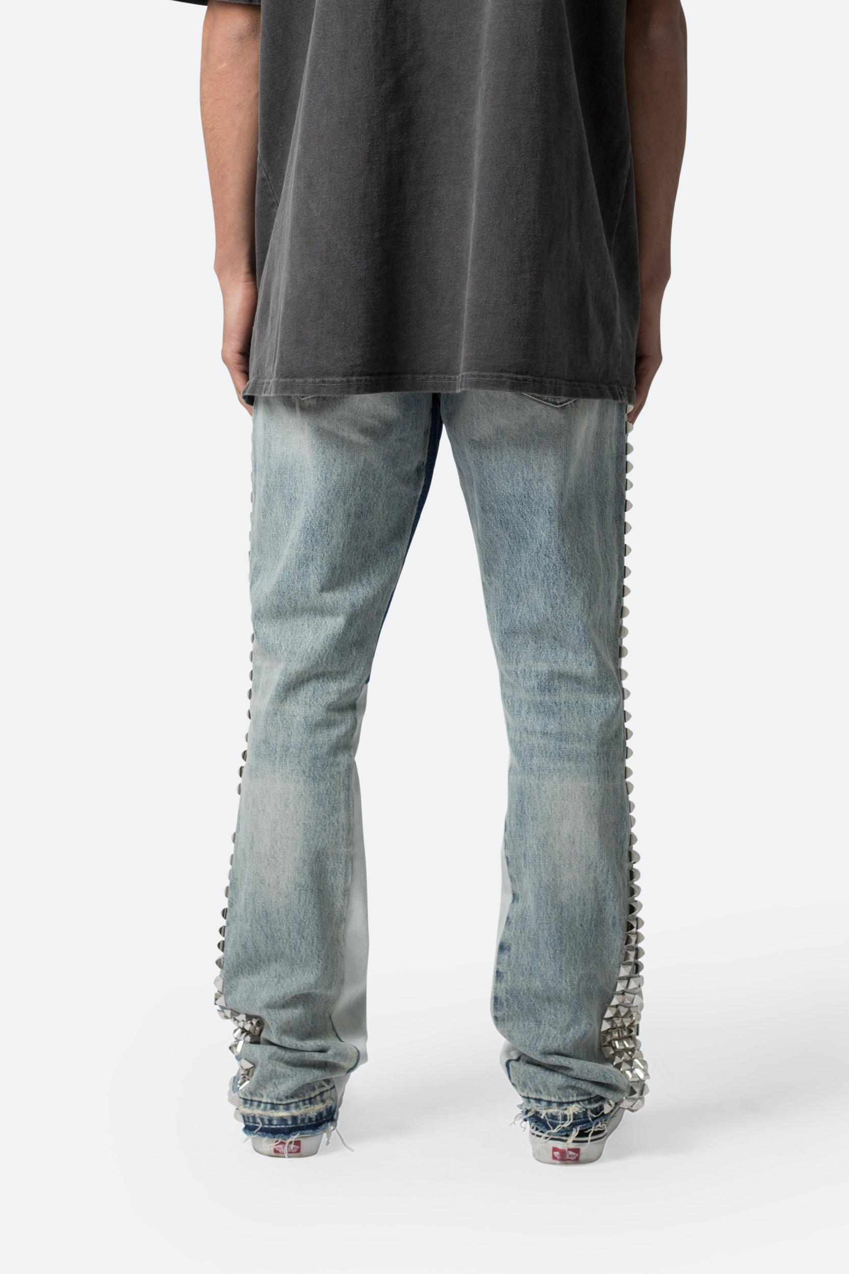 the B572 Studded Flare Denim are designed with our new B fit, which is relaxed through the thigh and features a slight flare at the leg opening and is constructed from washed blue denim, panelling at the inseam and outseam from contrasting denim for a slight flare, a deconstructed hem, and is finished with stud details