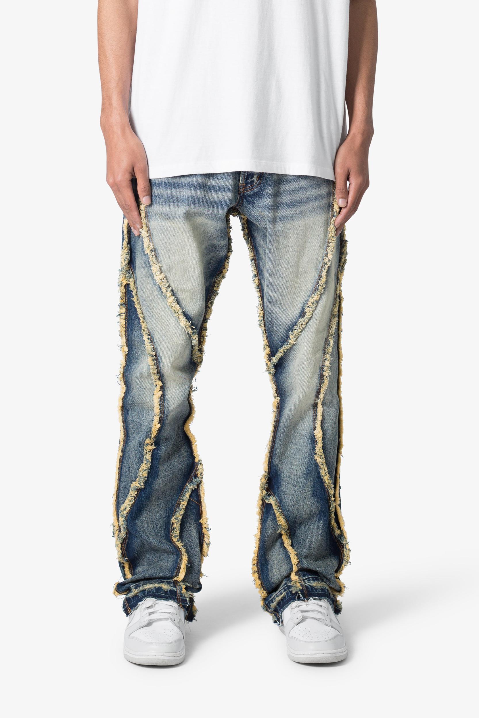the B638 Ethereal Flare Rip Denim are designed in our B fit, which is relaxed through the thigh and features a slight flare at the leg opening and is constructed from washed blue denim, heavy sanding details throughout for a more vintage feel and look, and finished with a exposed edge panelling. details flare at leg op