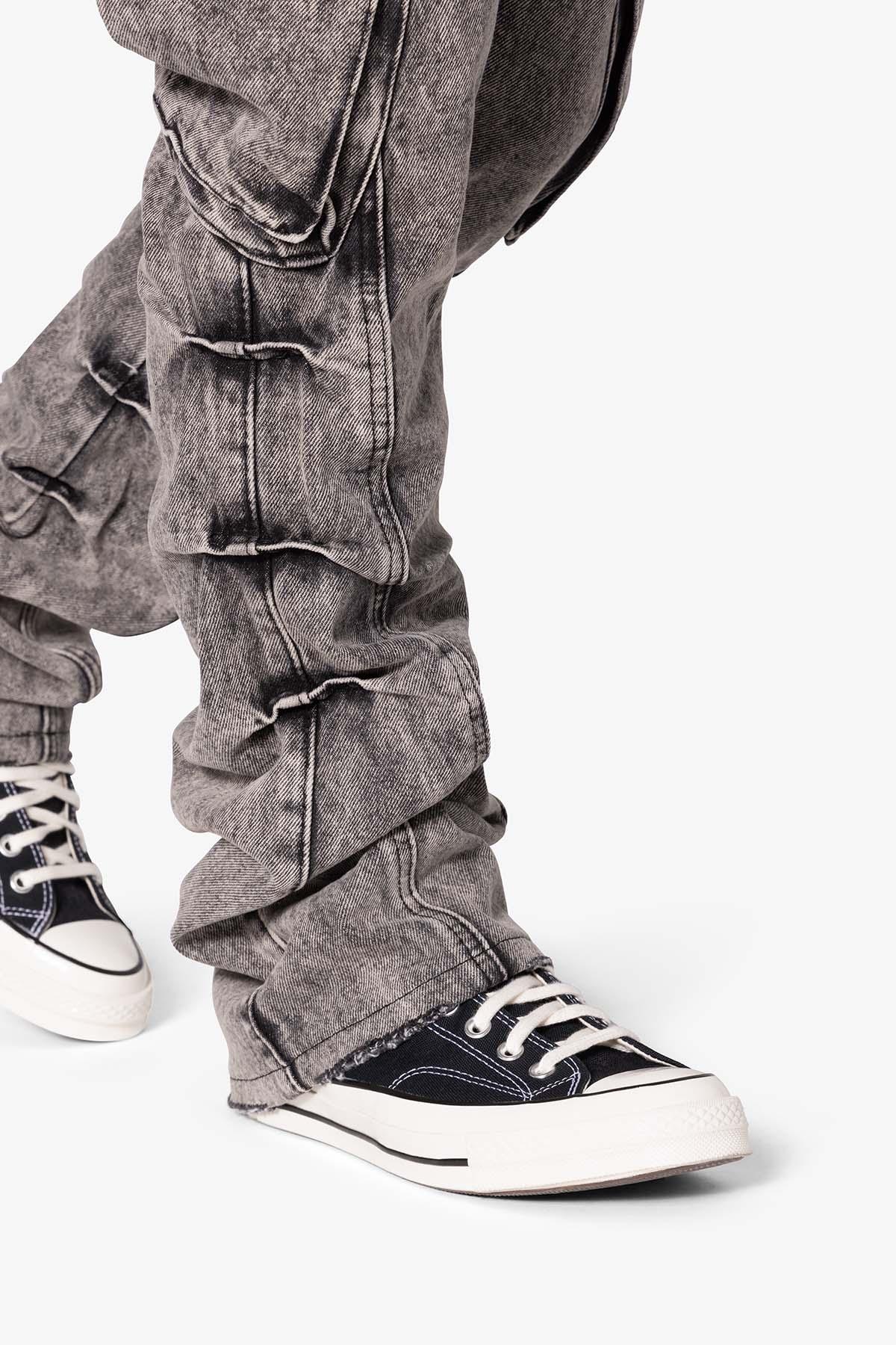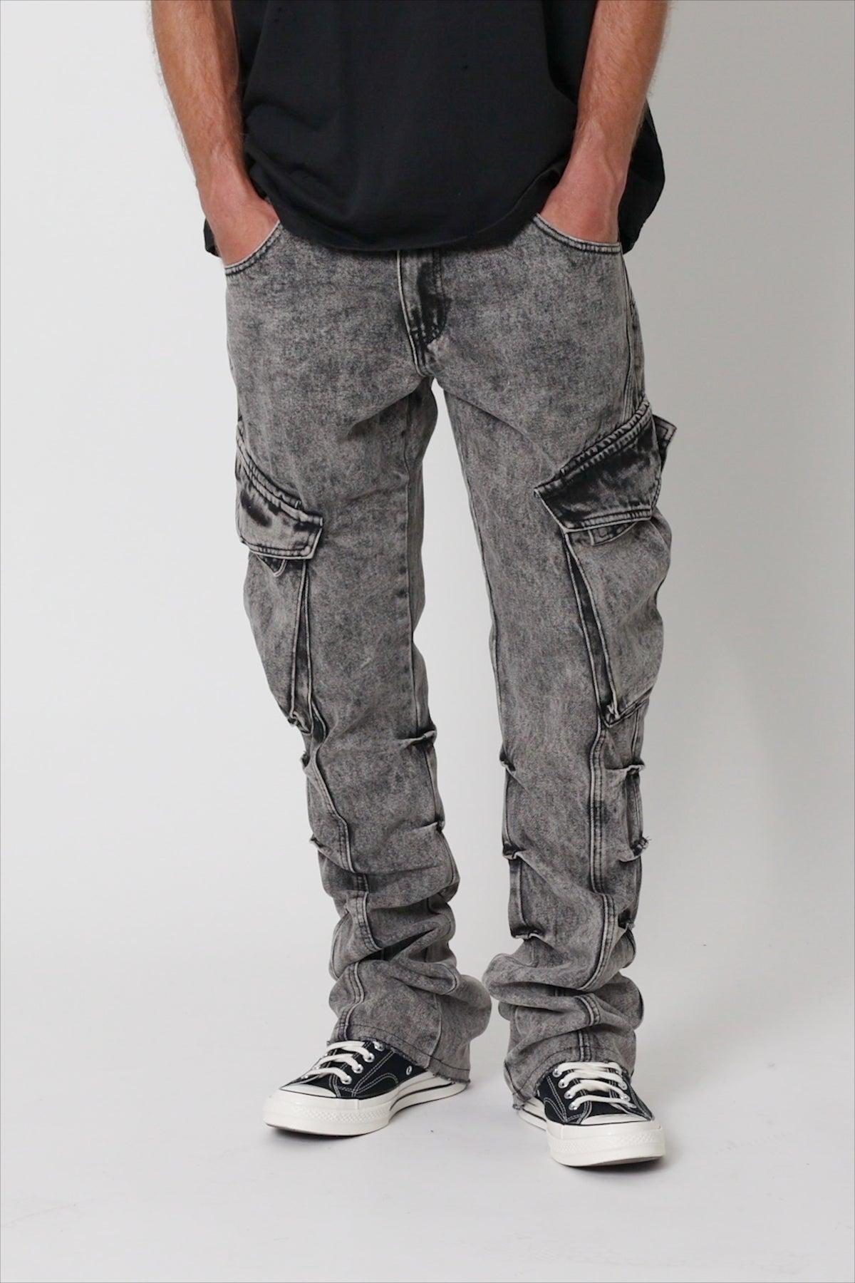 the B647 Cargo Seamed Flare Denim are designed with our new B fit, which is slim through the thigh and features a slight flare at the leg opening and is constructed from 100% cotton "crackle" like denim with a vintage wash, and finished with ultra cargo pockets on the side seam. details slim fit, flare at leg opening 1