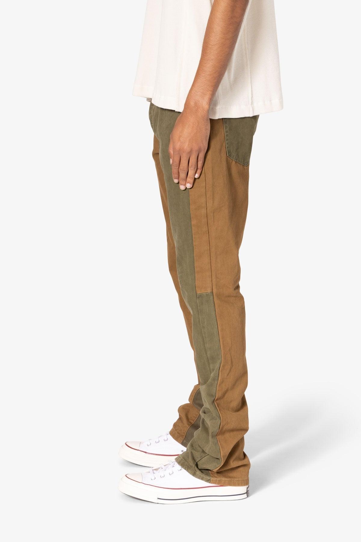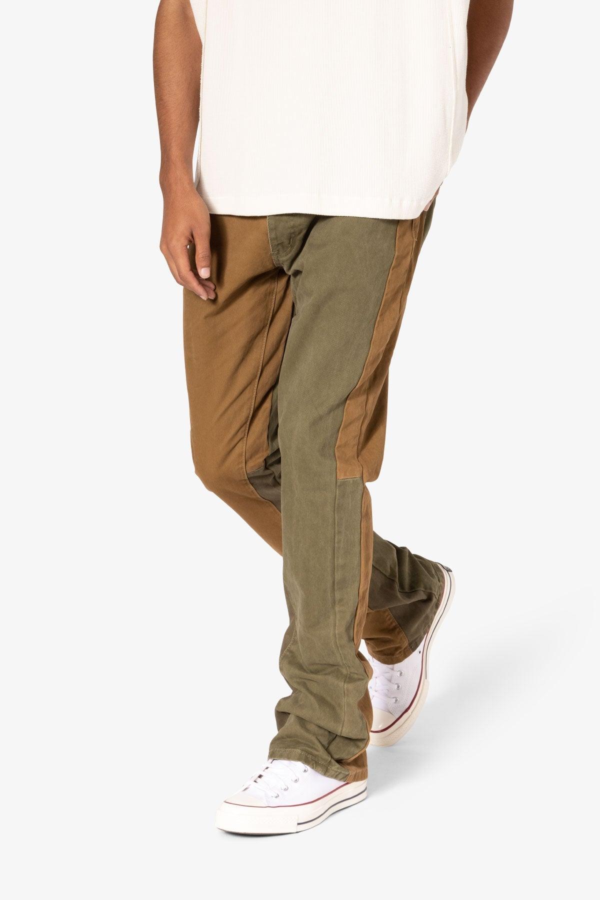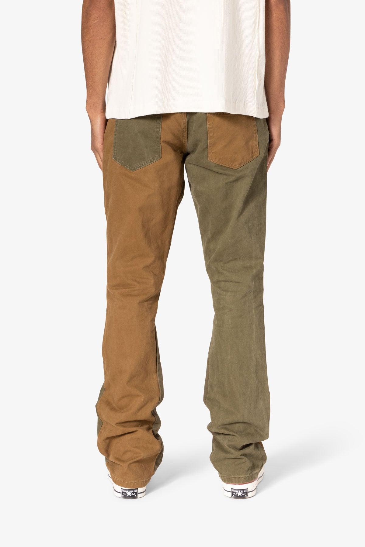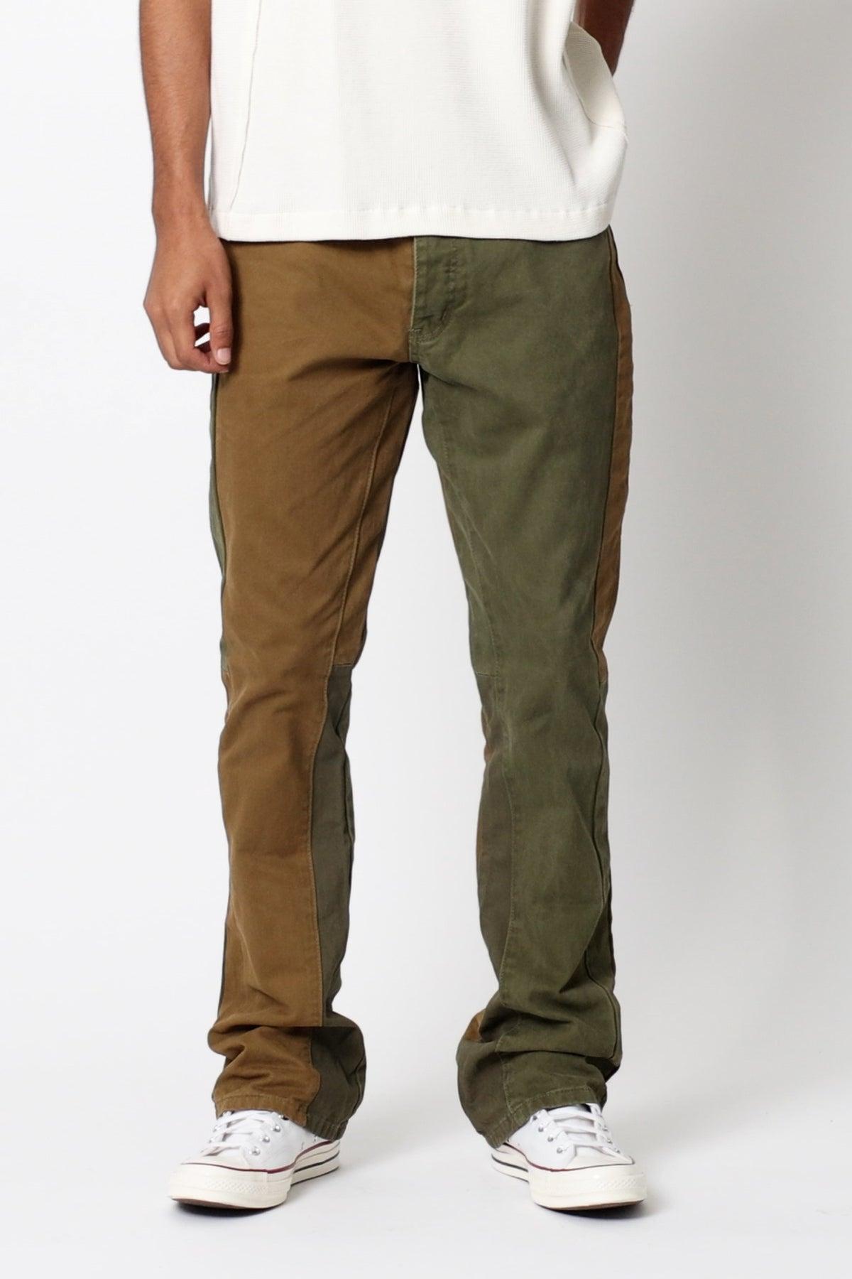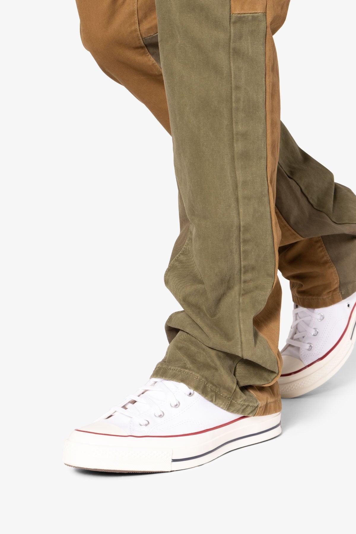 the B680 Flare Color Block Denim are designed with our new B fit, which is relaxed through the thigh and features a slight flare at the leg opening and is constructed from contrasting olive denim, panelling at the inseam and outseam from self fabric for a slight flare, distressing at the wearer's left knee, and finishe