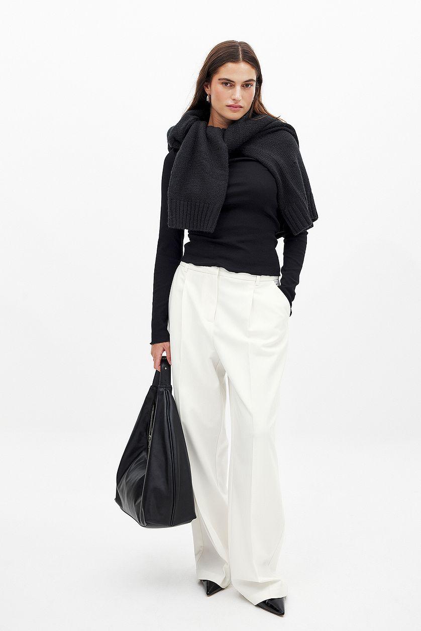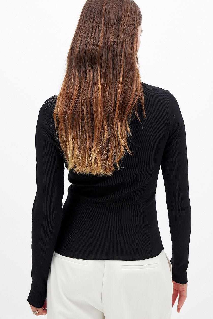 This top is ribbed and features a form fit and a babylock design. It has a slight high neck and long sleeves.