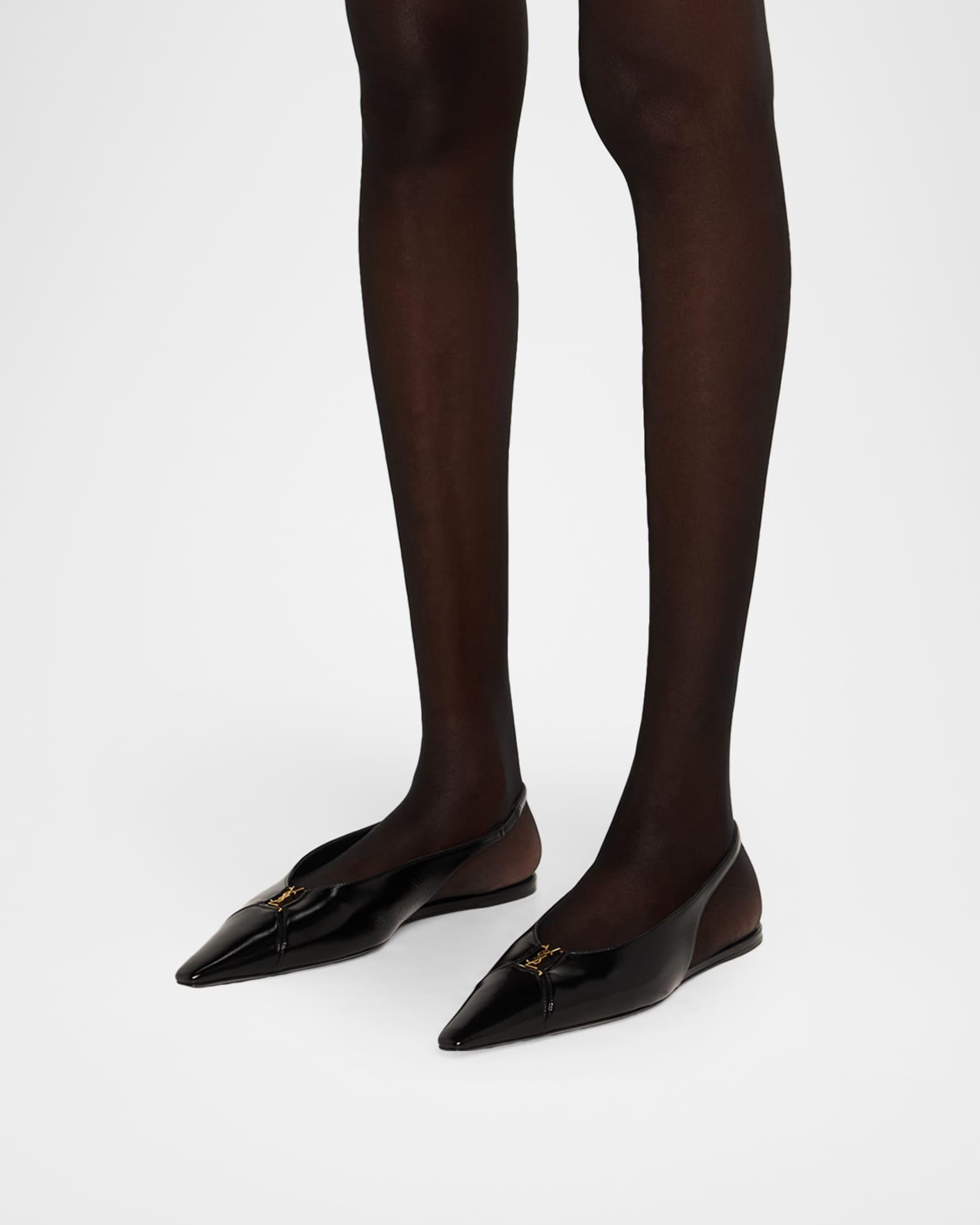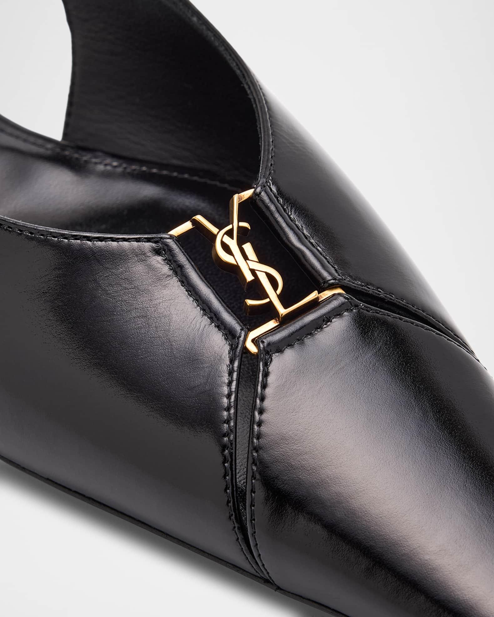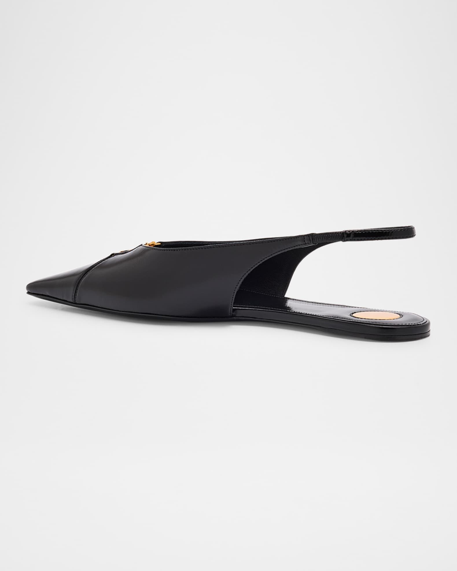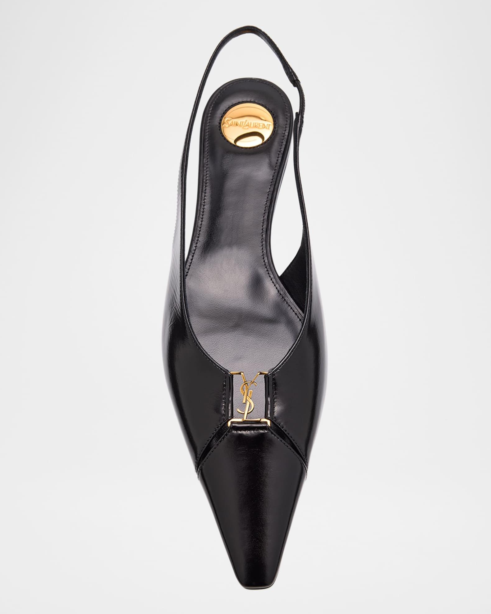 Saint Laurent "Babylone" ballerina flats in smooth calfskin leather with a golden YSL medallion accent Flat heel Pointed toe Stretch slingback strap Lining: Leather Made in Italy Size Note: Saint Laurent shoes run small. Please order a 1/2 size larger than you typically wear.