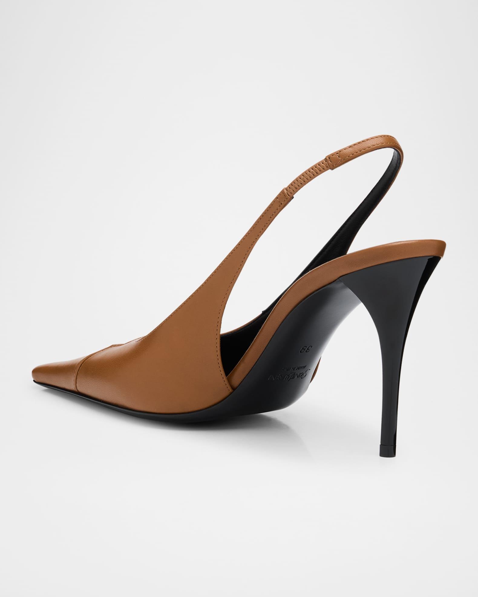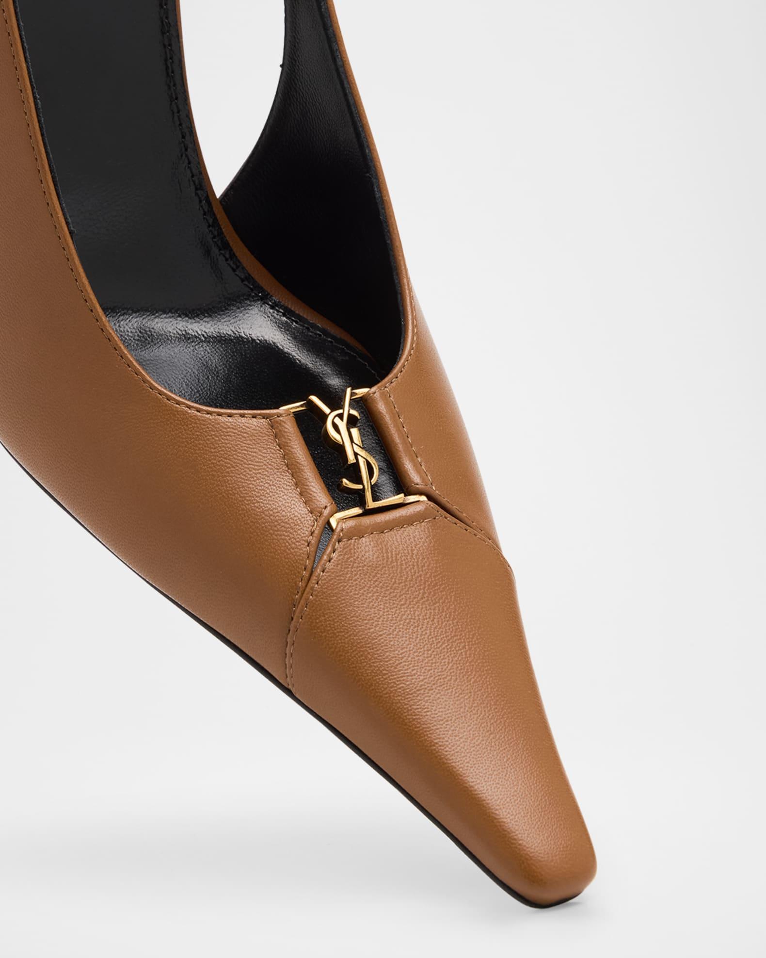 Saint Laurent "Babylone" pumps in smooth lambskin leather with a golden YSL medallion accent 3.50 in / 90 mm stiletto heel Pointed toe Stretch slingback Leather outsole Lining: Unlined Made in Italy Size Note: Saint Laurent shoes run small. Please order a 1/2 size larger than you typically wear.