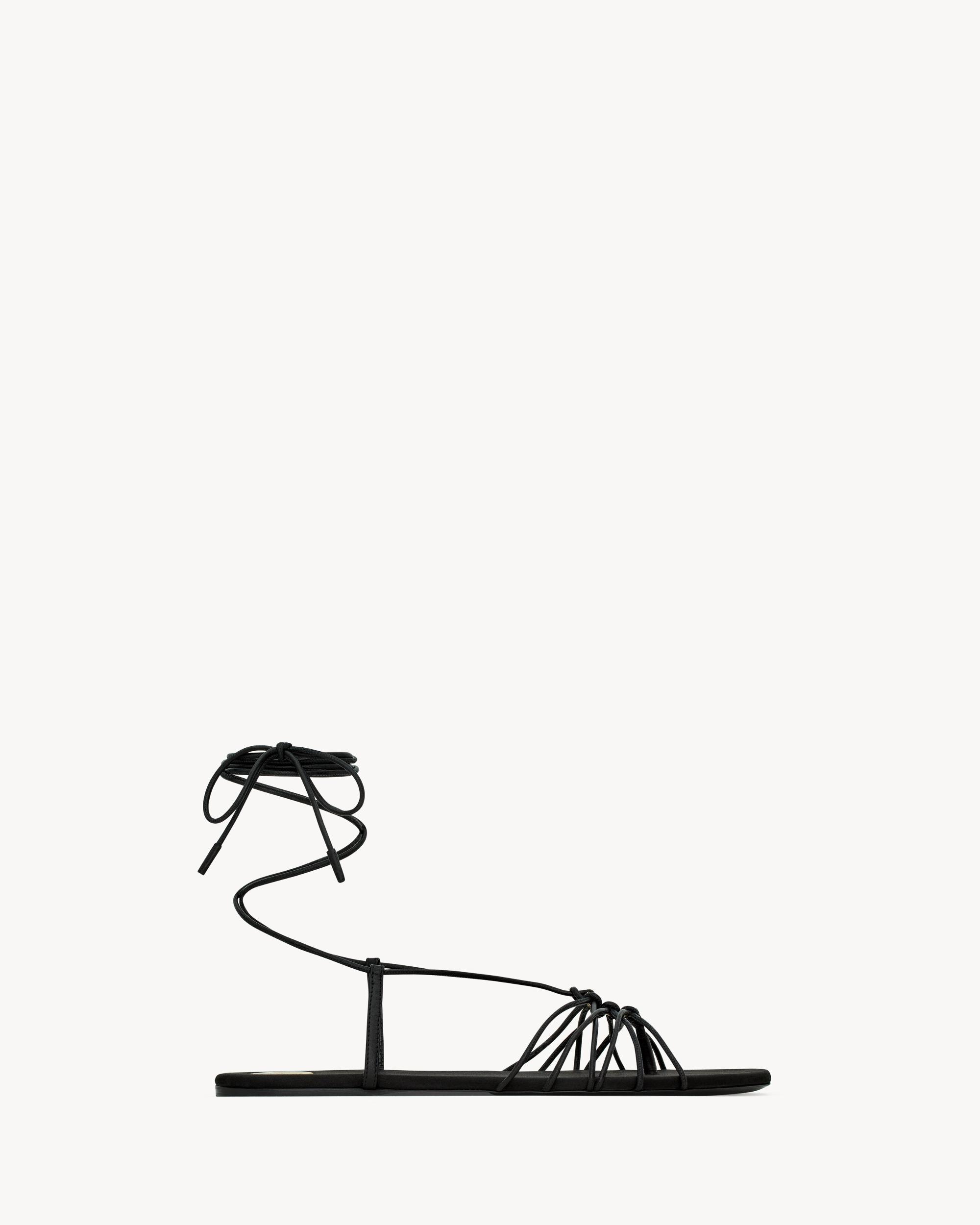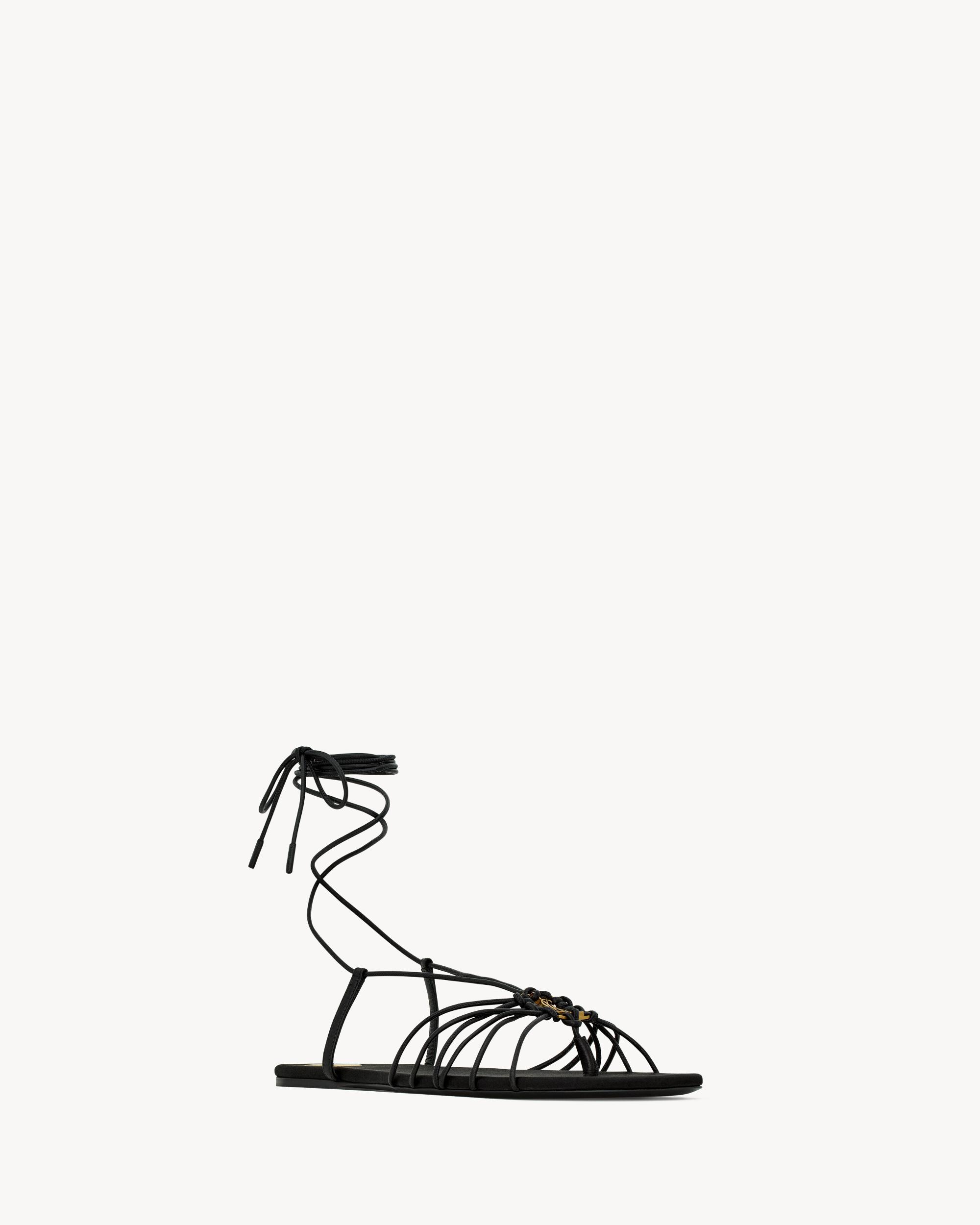 flat sandals decorated with the CASSANDRE, featuring an almond toe, lace-up ankle straps, and satin insole.
