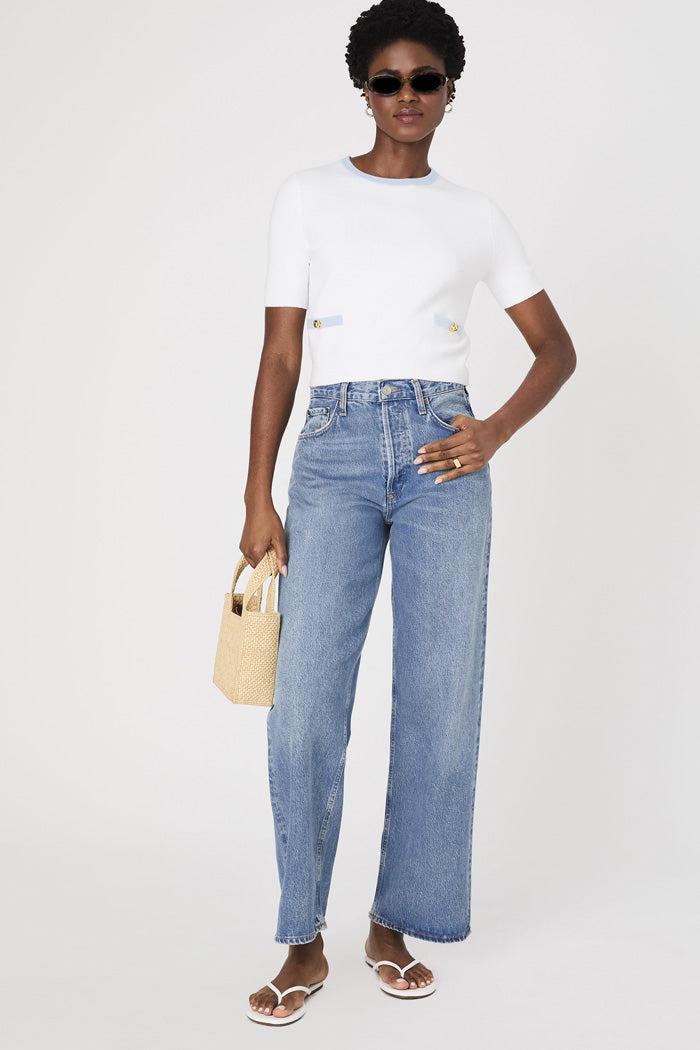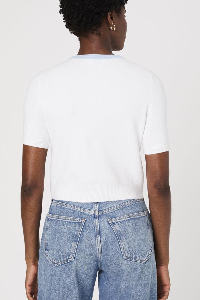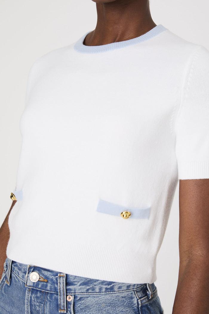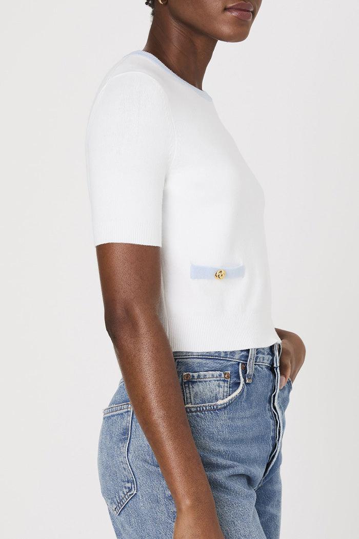 Introducing our Babysoft Short Sleeve Top, perfect for adding a touch of charm to your wardrobe. Crafted from a soft, lightweight knit, it features elegant white trim along the neckline and two front facing pockets for a classic contrast. This sweater effortlessly blends comfort with chic, making it an ideal choice for any occasion.