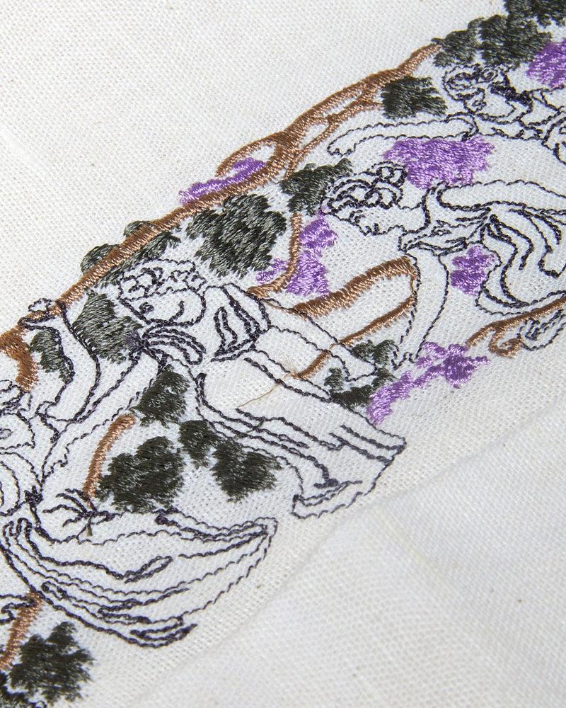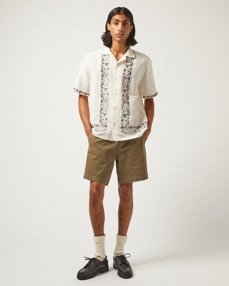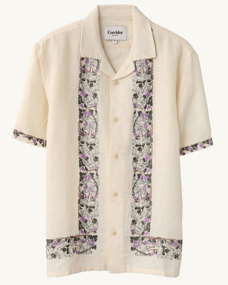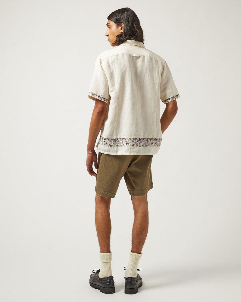 55% Linen 45% Cotton Embroidery on sleeve, front panels, and bottom hem Camp collar Regular fit Made with care in India SS0231 Adarsh is 6’2” and is wearing a size M For information on our shipping and return policies, click here.