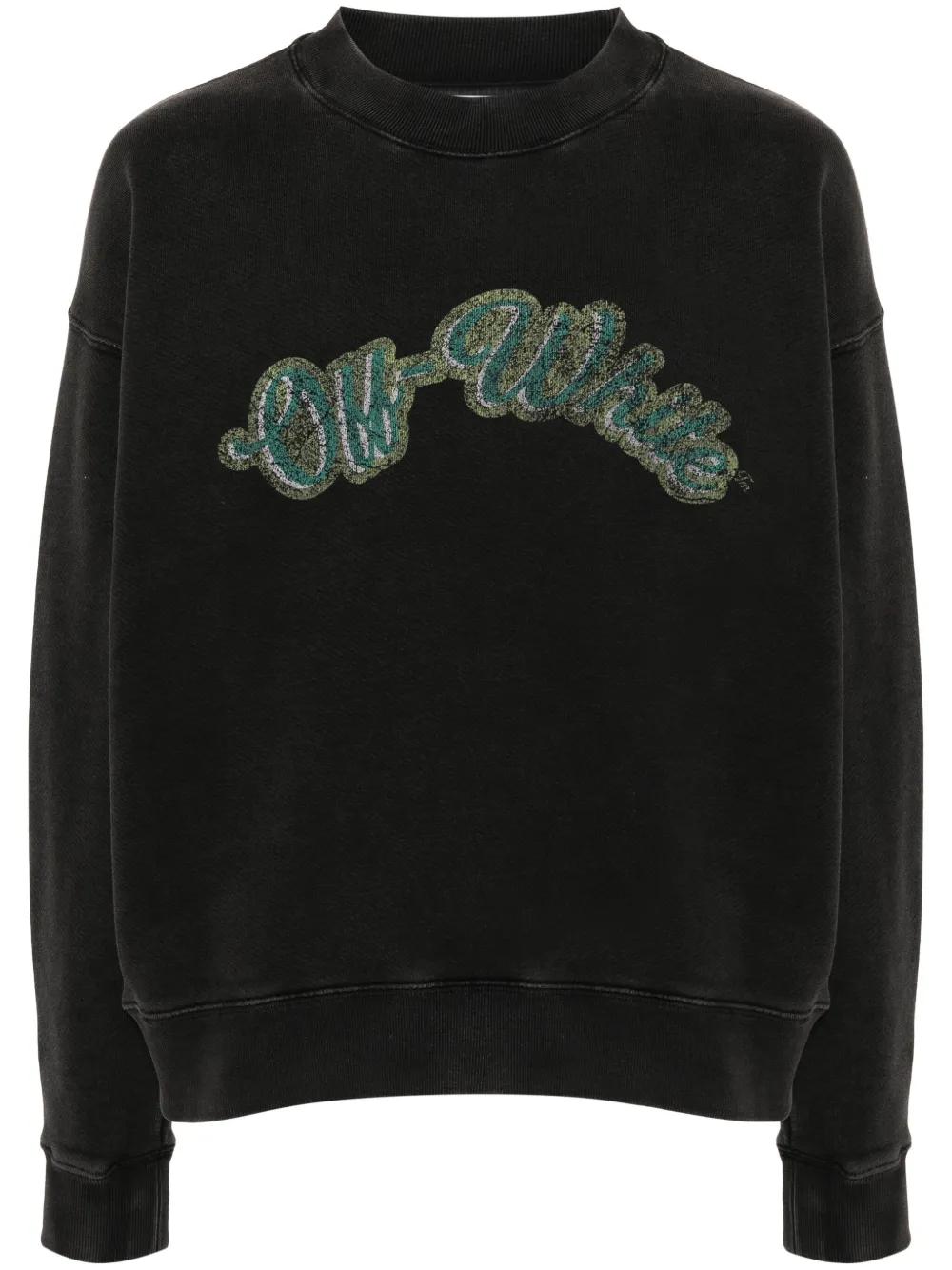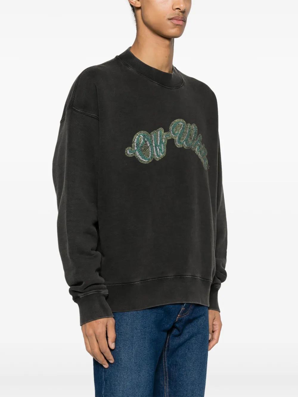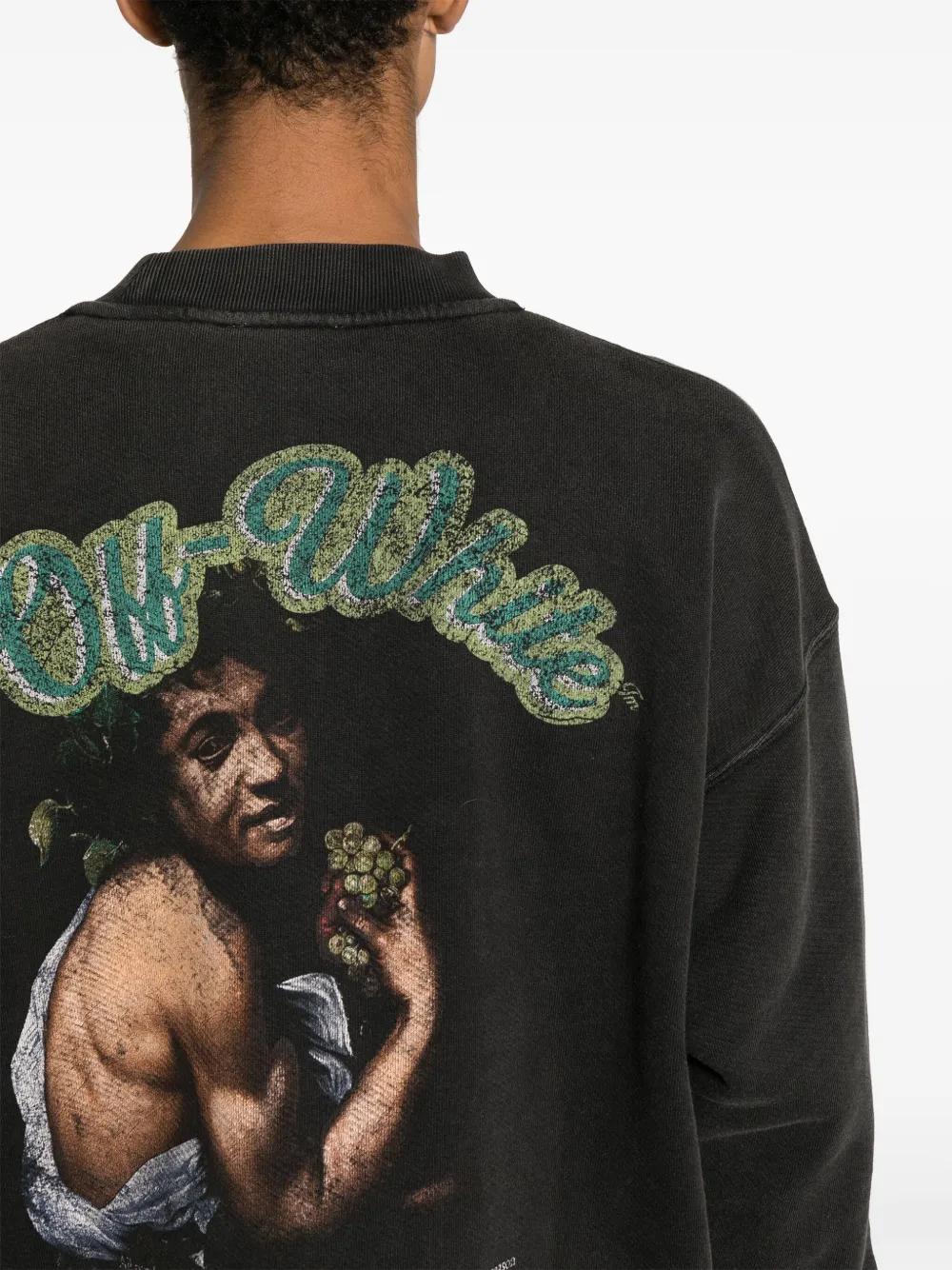 Off-White takes inspiration from all corners of the cultural world – the print at the back of this faded black sweatshirt is a replica of Caravaggio’s painting of the Greco-Roman god Bacchus. Both it and the logos are cracked to resemble the look of ancient art.