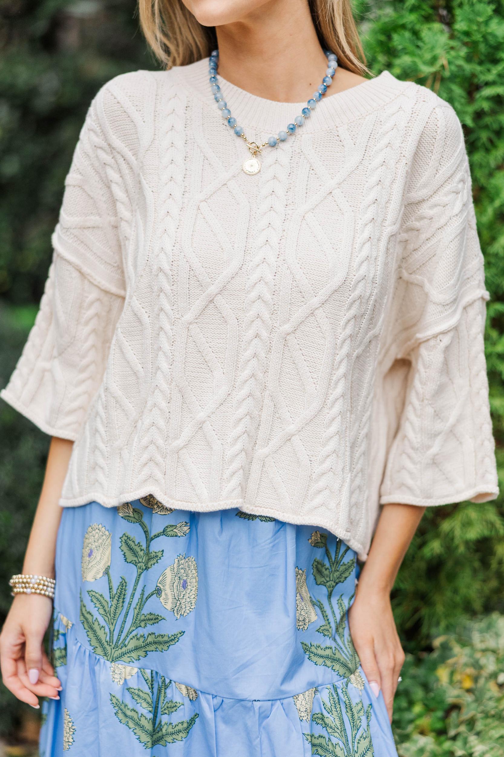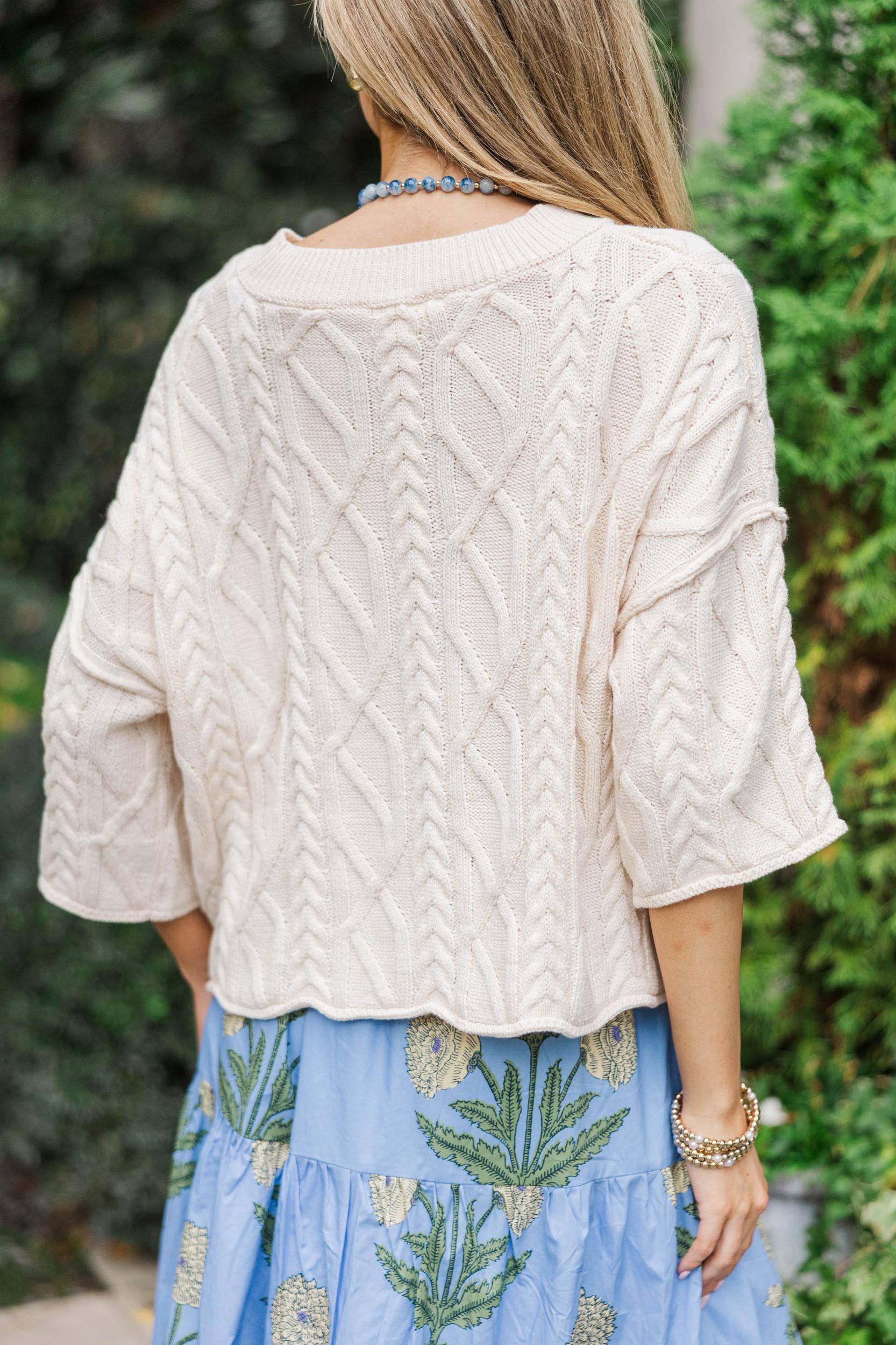 This beautifully textured sweater is a timeless staple with its soft knit feel and relaxed, easy silhouette. Designed to feel cozy yet polished, it’s perfect for everyday wear when you want something comfortable that still looks put together. Style it with denim, skirts, or tailored bottoms for an effortlessly chic look. Classic round neckline Elbow-length sleeves Soft cable-knit texture Straight hemline Soft fabric with moderate stretch London is wearing the small.