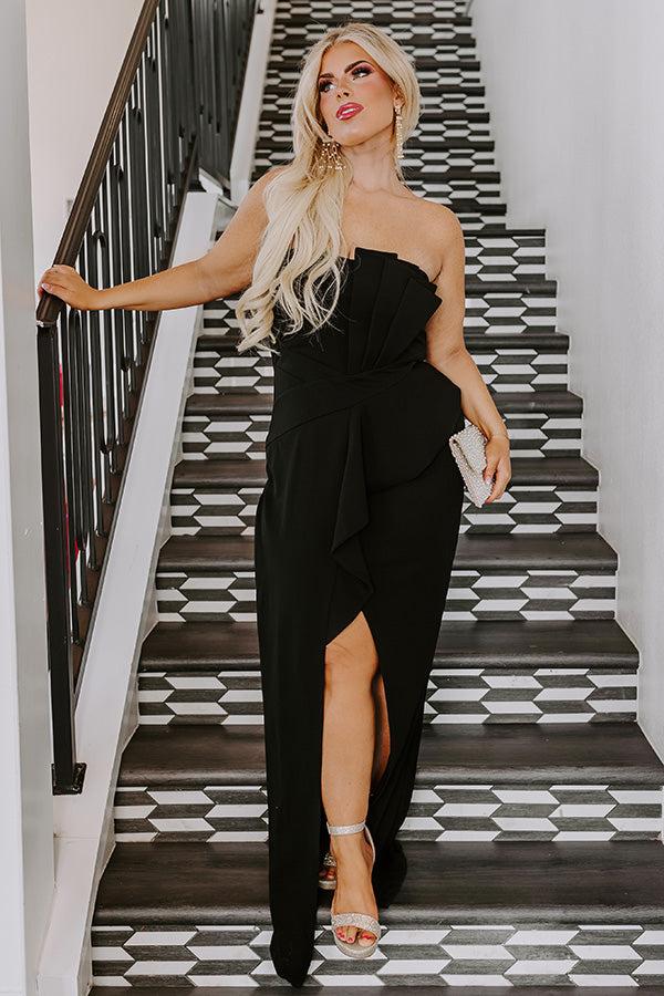 - Perfect to make a glamorous statement, this must-have dress will keep you looking gorgeous! - Stretchy black material - Strapless cut with back zip closure - Pleated bodice design - Front ruffle detail - Flattering faux wrap skirt silhouette that ends in a straight floor length hemline Measurements 1XL : Bust 34", Hip 40", Length 58", Waist 36". 2XL : Bust 36", Hip 42", Length 58", Waist 38". 3XL : Bust 38", Hip 44", Length 59", Waist 40".