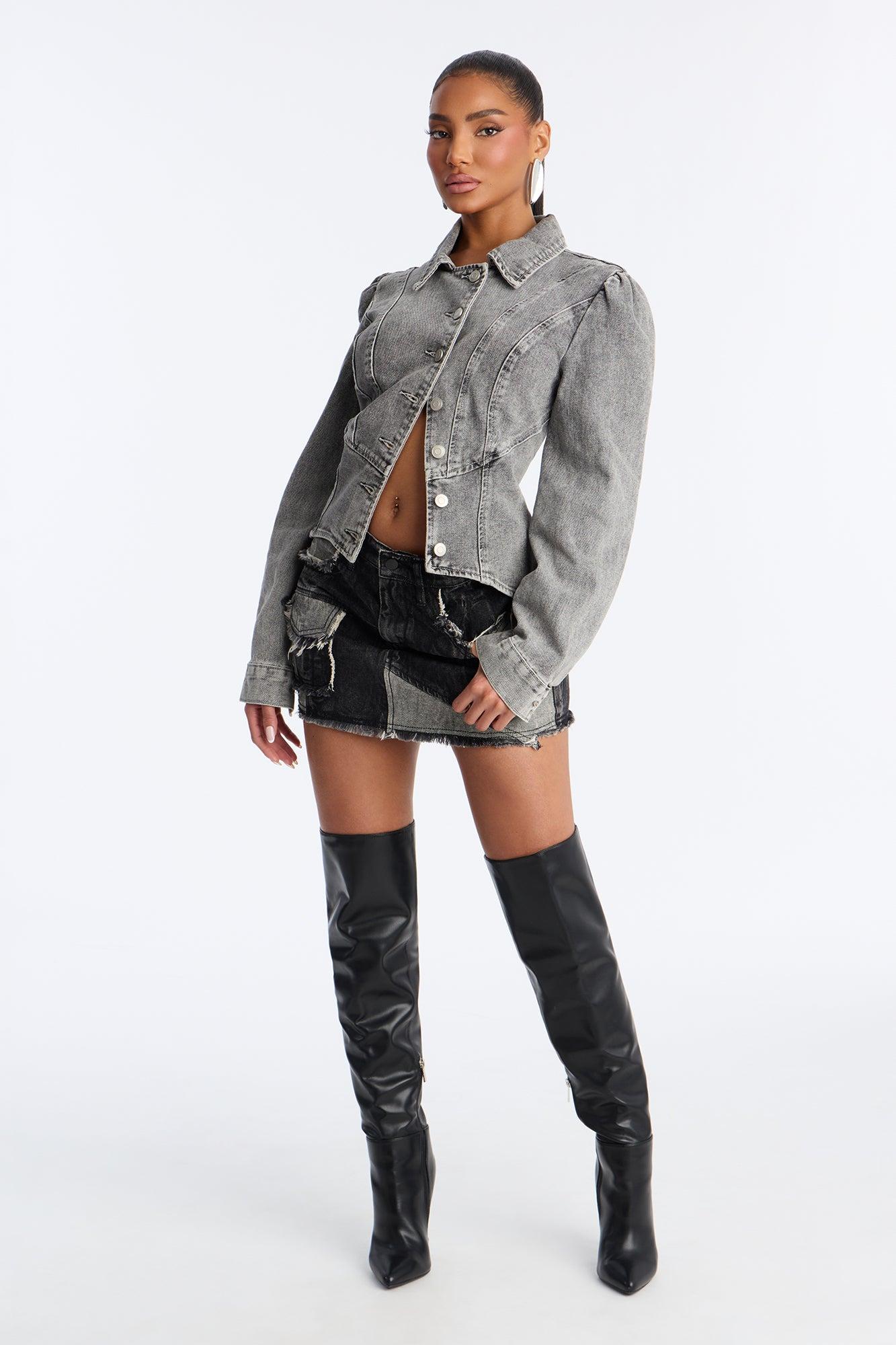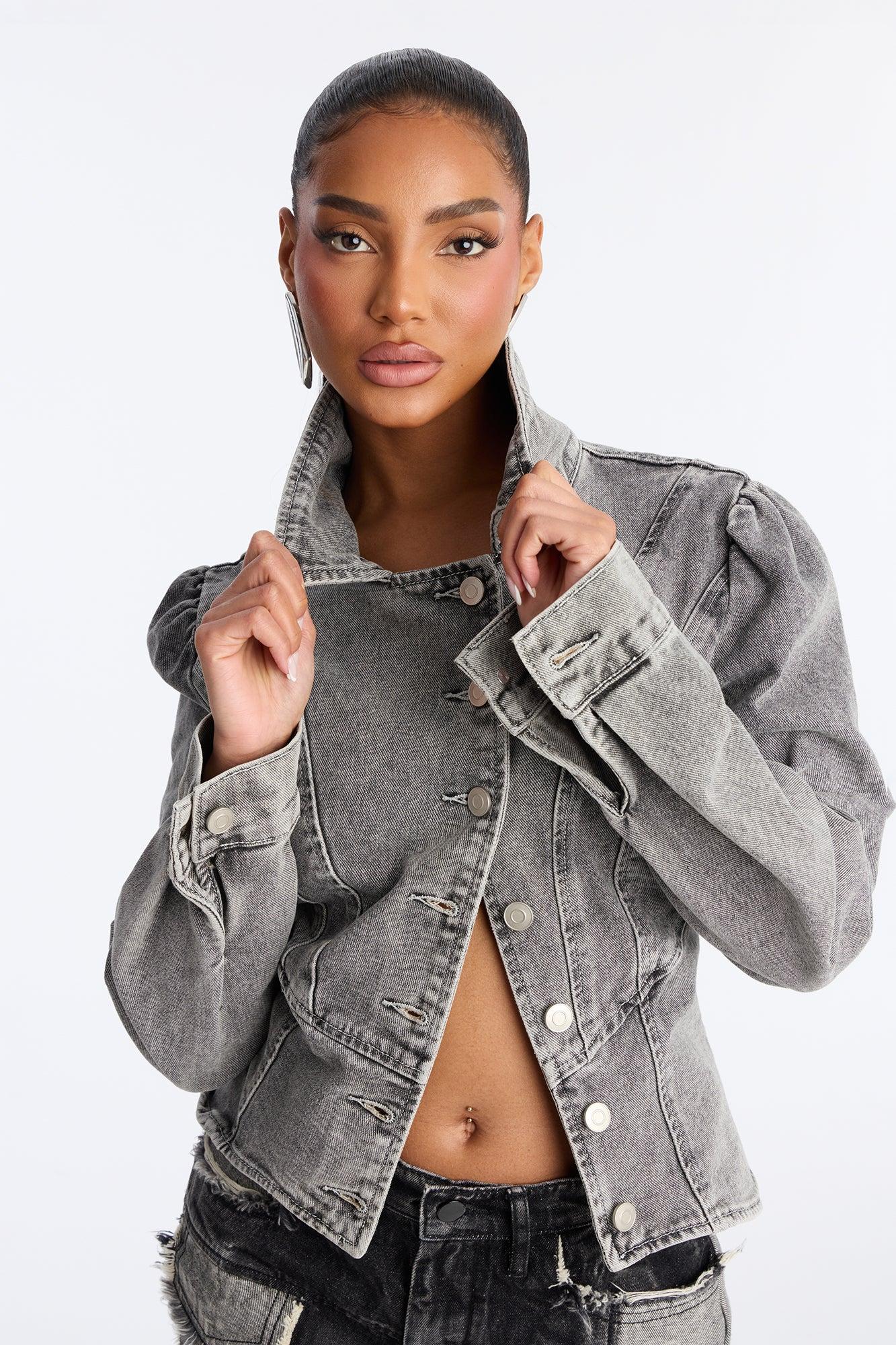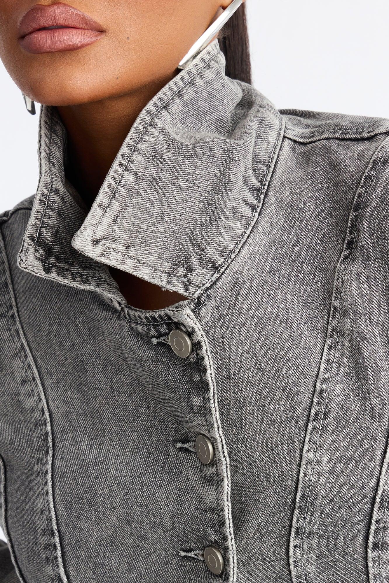 Available In Grey. Denim Jacket Collar Button Closure Corset Detail Denim Rigid Disclaimer: Due To The Specialized Wash & Distressing Process, Each Garment Is Unique. 81% Cotton 11% Rayon 8% Polyester Imported California Proposition 65WARNING: Cancer and Reproductive Harm - www.P65Warnings.ca.gov.