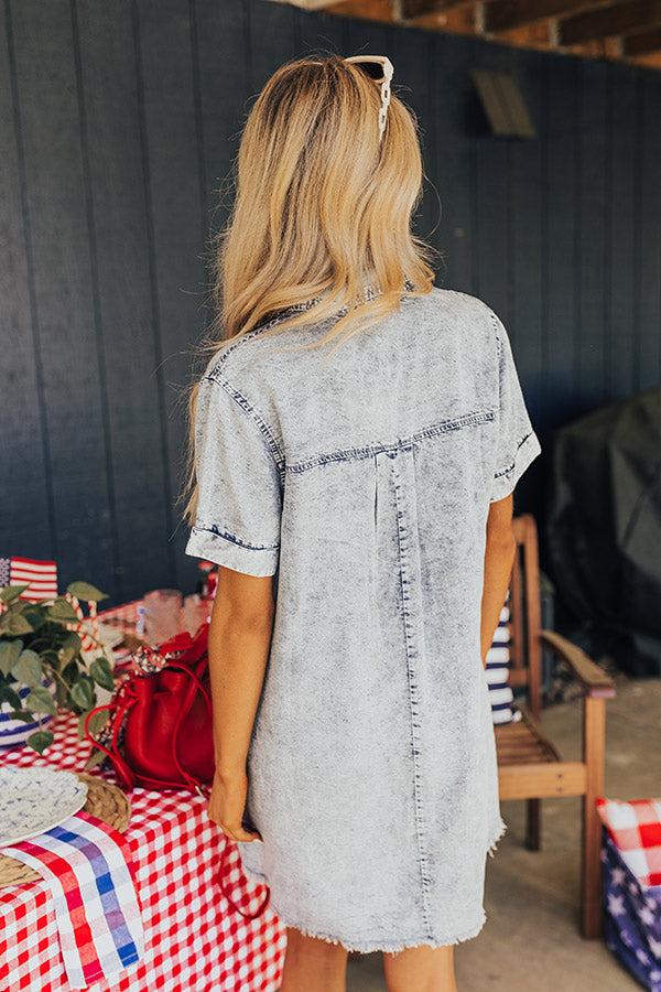 - An updated twist on classic style, this trendy chambray dress is perfect for making a stylish statement! - Unlined acid washed chambray material - A collared v-cut neckline with two hidden buttons for additional optional closure - A functional chest pocket - Short sleeves with rolled cuffs - A relaxed silhouette that ends in an unfinished, frayed hemline Measurements S : Bust 36", Hip 40", Length 31", Sleeve Length 7.5", Waist 38". M : Bust 38", Hip 42", Length 33", Sleeve Length 8.5", Waist 40". L : Bust 40", Hip 44", Length 34", Sleeve Length 9", Waist 42".