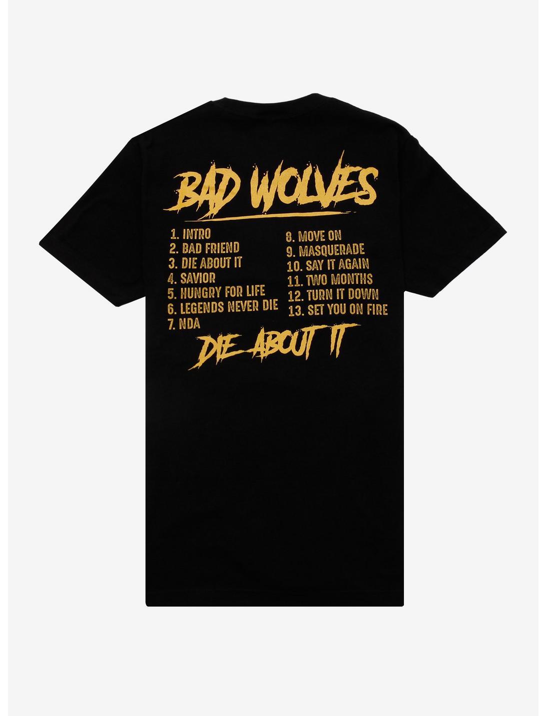 Legends never die! Live it up in this Bad Wolves tee! Featuring the poison apple artwork from their album, Die About It. Peep the back for the album's track list.100% cottonWash cold; dry lowImportedListed in men's/unisex sizes