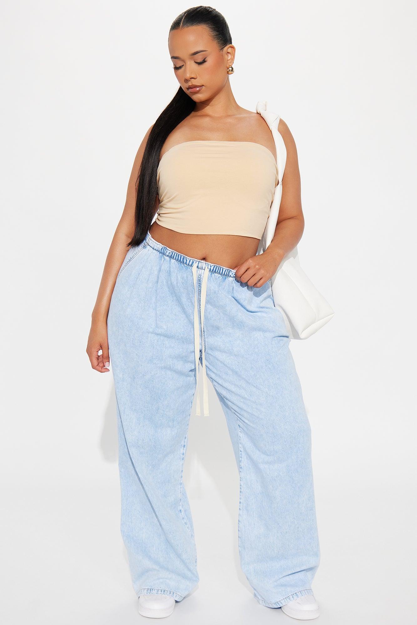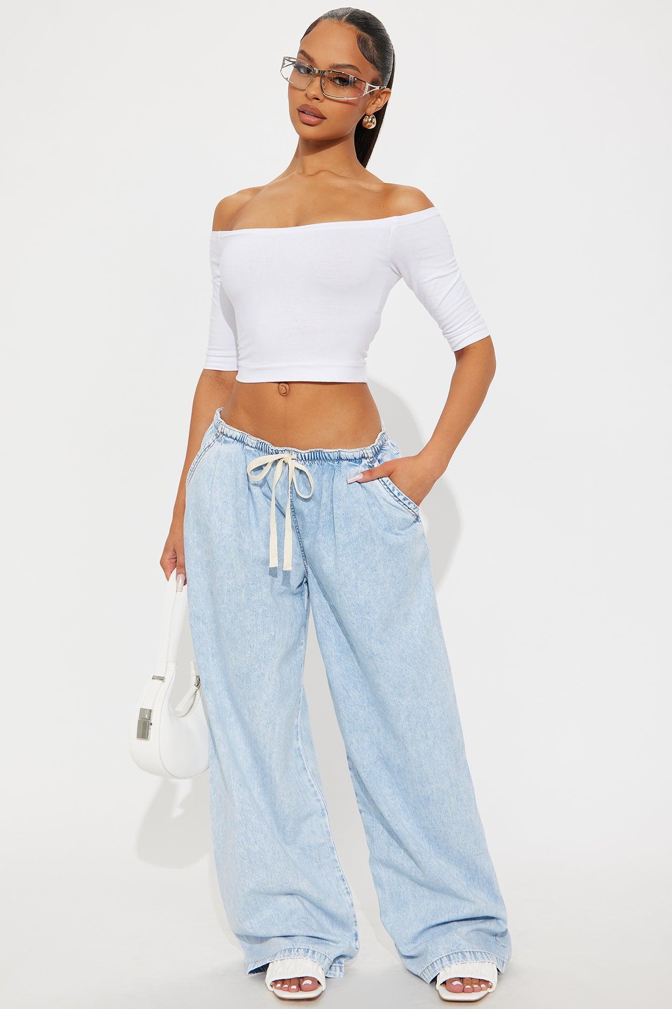 Available In Light Wash. Wide Leg Jean Tie Waist Drop Waist Non Stretch Denim 10" Rise 31" Inseam 80% Cotton 20% Rayon Imported California Proposition 65WARNING: Cancer and Reproductive Harm - www.P65Warnings.ca.gov.
