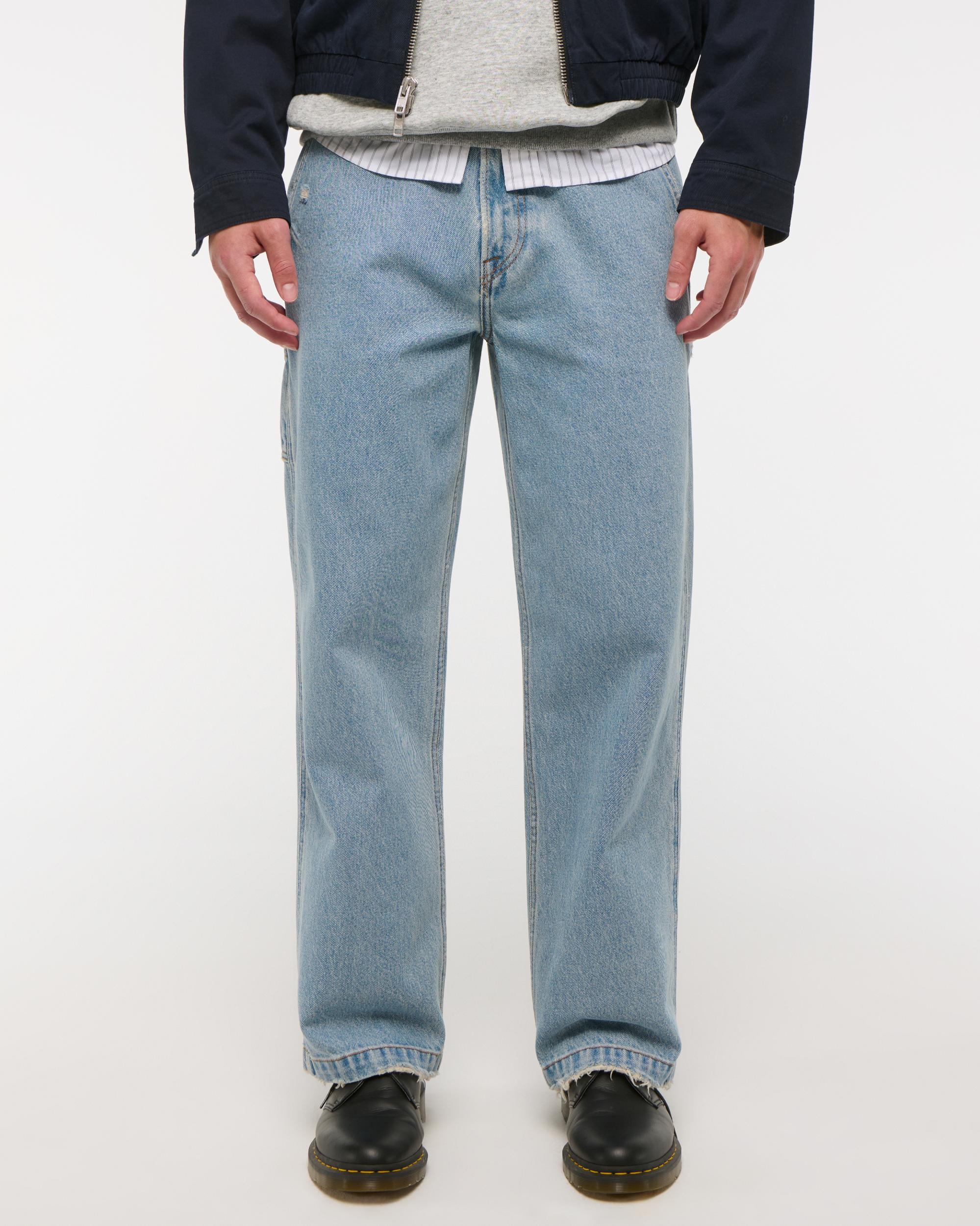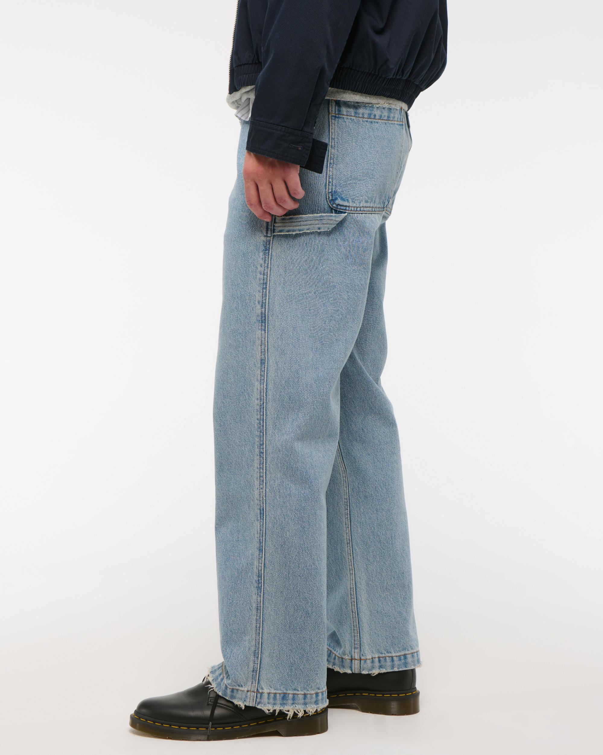 Our baggy jeans that are relaxed and baggy-fitting through the leg with slight puddle at the shoe, in our 100% cotton no-stretch fabric and broken-in denim feel. Features a light wash, painter-style utility details and clean hem. Features a longer inseam designed to puddle around the shoe. For a shorter visual, choose a shorter inseam.
