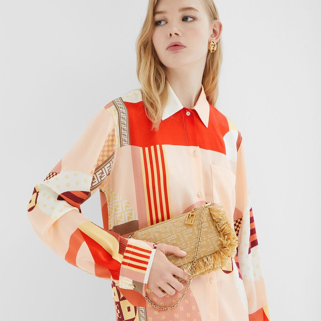 Baguette pouch made of natural-colored jacquard fabric with the iconic FF motif in viscose raffia. Decorated with fringes along the edges. Closed by zipper and zipper-pull with iconic FF motif. Lined interior, pocket with card holder slots and gold-finish metalware. It can be carried by hand, under the arm or cross-body thanks to the short, slim chain shoulder strap and long leather shoulder strap, both detachable. Holds a 6.7-inch smartphone and keys. The card holder is integrated inside the bag. Made in Italy