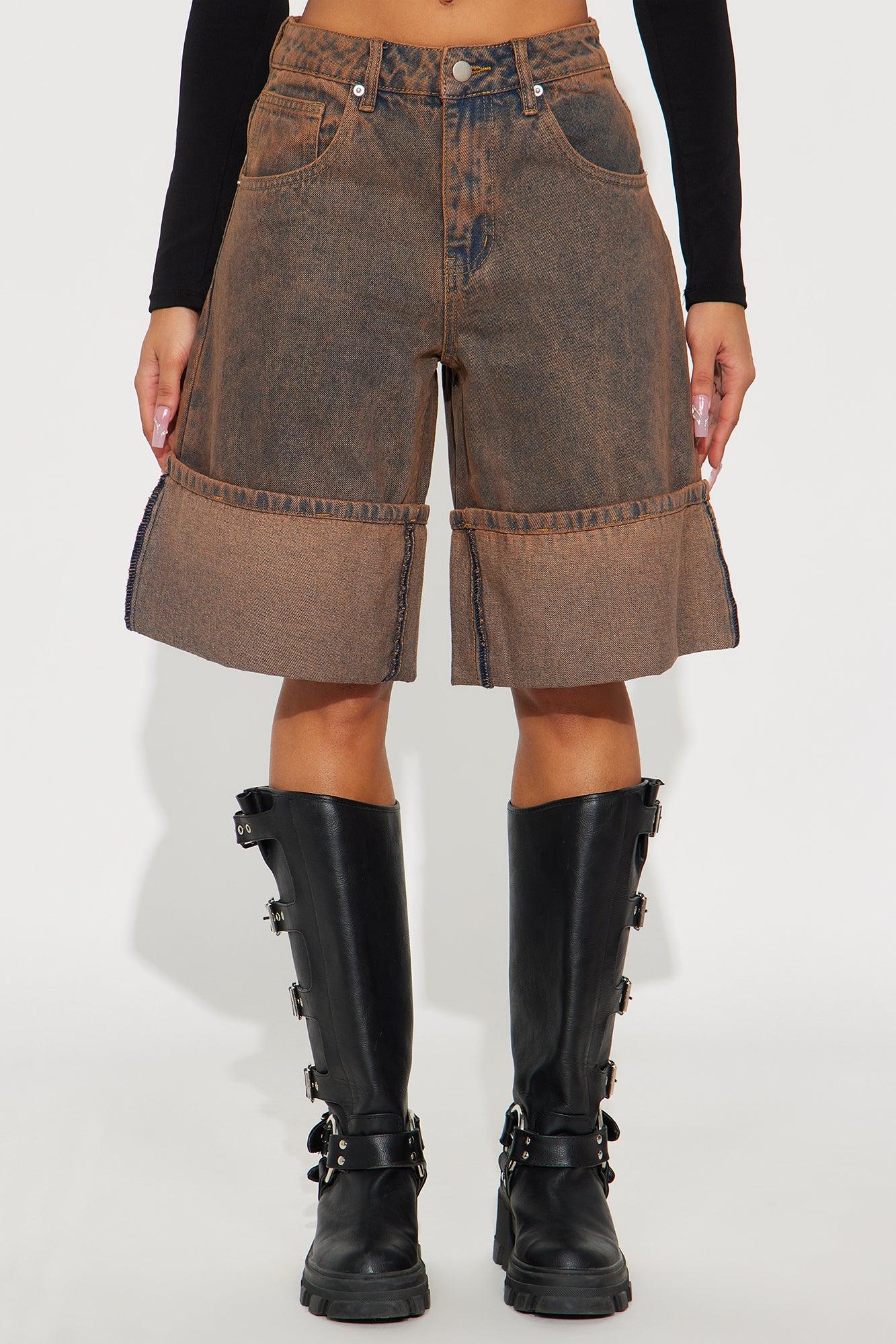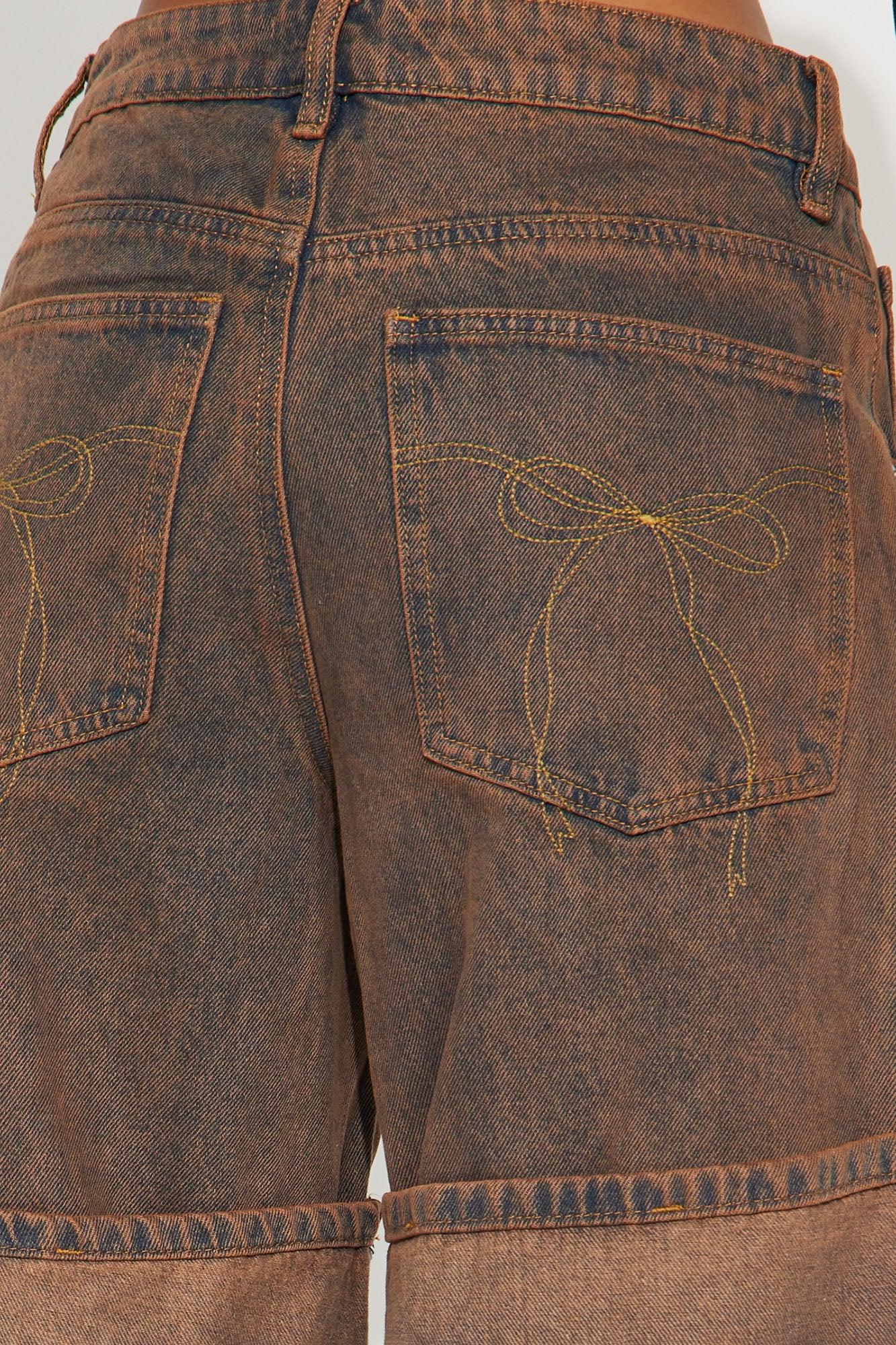 Available In Brown. Denim Jorts 5 Pocket Garment Dyed Bow Detail Tacked Cuff 11" Rise 11" Inseam Non-Stretch Disclaimer: Due To The Specialized Distressing & Wash Process, Each Garment Is Unique. Self: 82% Cotton 14% Viscose 4% Polyester Imported
