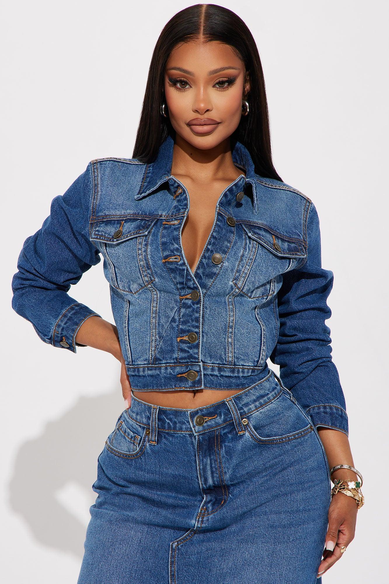 Available In Medium Wash. Denim Skirt Set Jacket Collar Button Closure Chest Pockets Maxi Skirt Button and Zipper Closure Belt Loops Slit Detail High Stretch Disclaimer: Due To The Specialized Wash Process, Each Garment Is Unique. 100% Cotton Imported