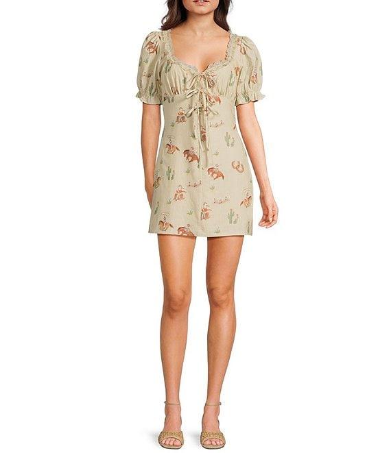 From Bailey Rose, this dress features: Western horse/cowgirl print Sweetheart lace neckline Short sleeves Tie front Polyester/rayon Hand wash Imported.