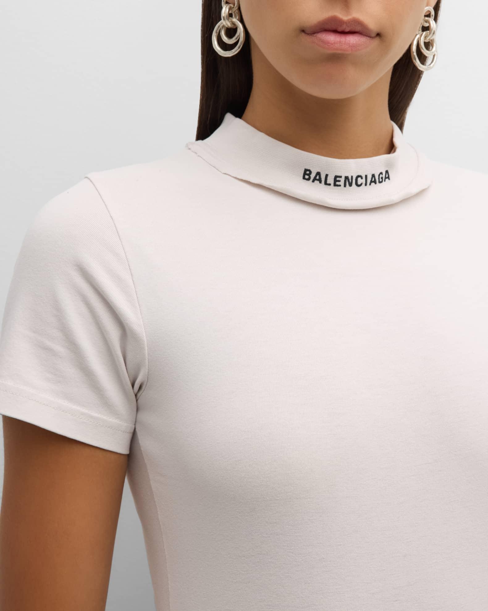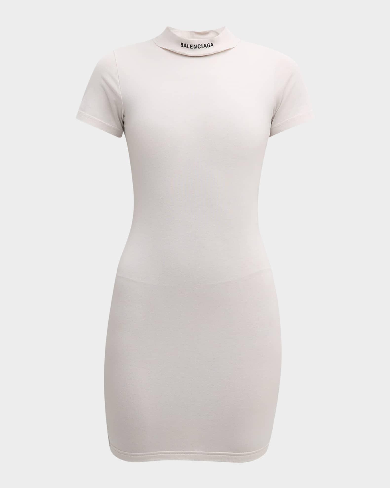 • peeling stretch jersey • double crewneck with ripped-out effect • short sleeves • mini length • anti-slip band at hem • balenciaga logo embroidered at front collar • made in portugal Balenciaga Dress in neckline Short Sleeve Hem falls above the knee Cotton/elastane Made in Portugal