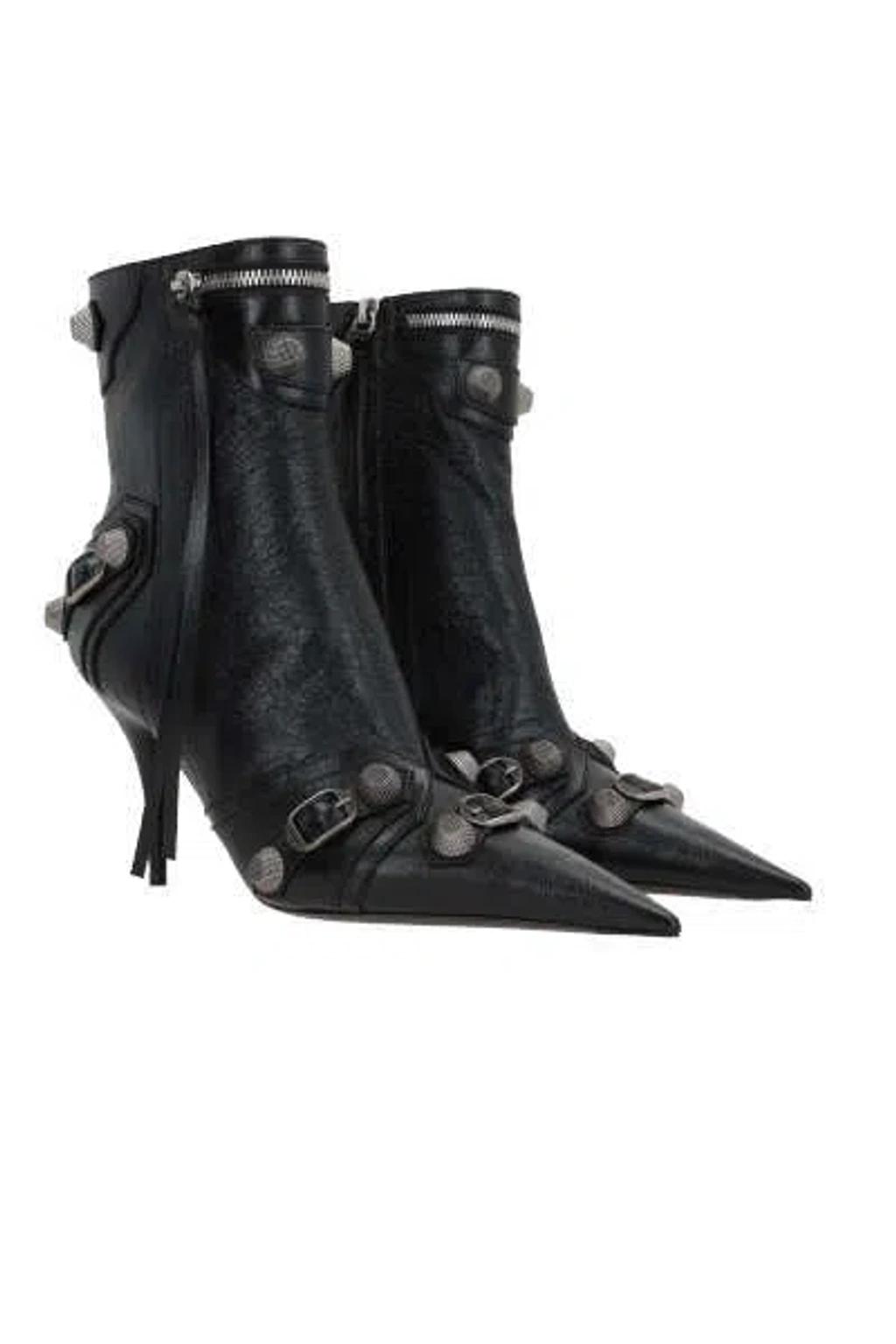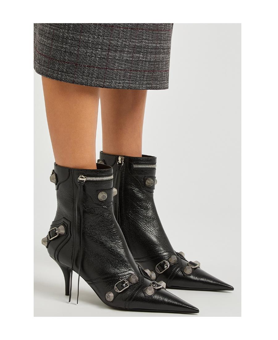 Shop Balenciaga Womens Cagole Lambskin Buckle Zip Ankle Booties In Black from 800+ stores, starting at $898. Black leather Cagole leather ankle boots from BALENCIAGA featuring crinkled finish, silver-tone stud detailing, decorative buckle detail, tassel detail, decorative zip detailing, side zip fastening, pointed toe, branded leather insole, ankle-length and 90mm stiletto heel.