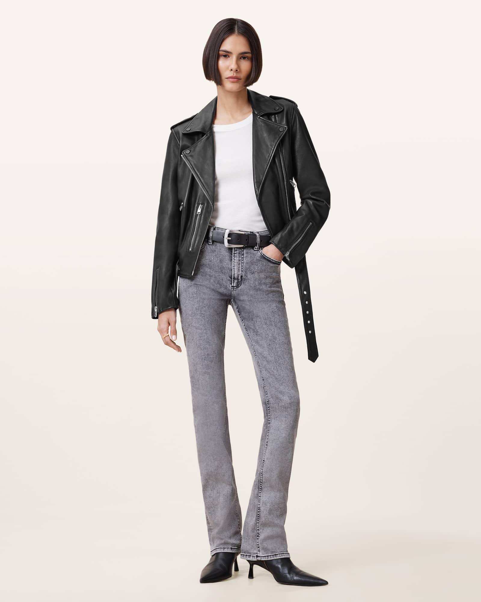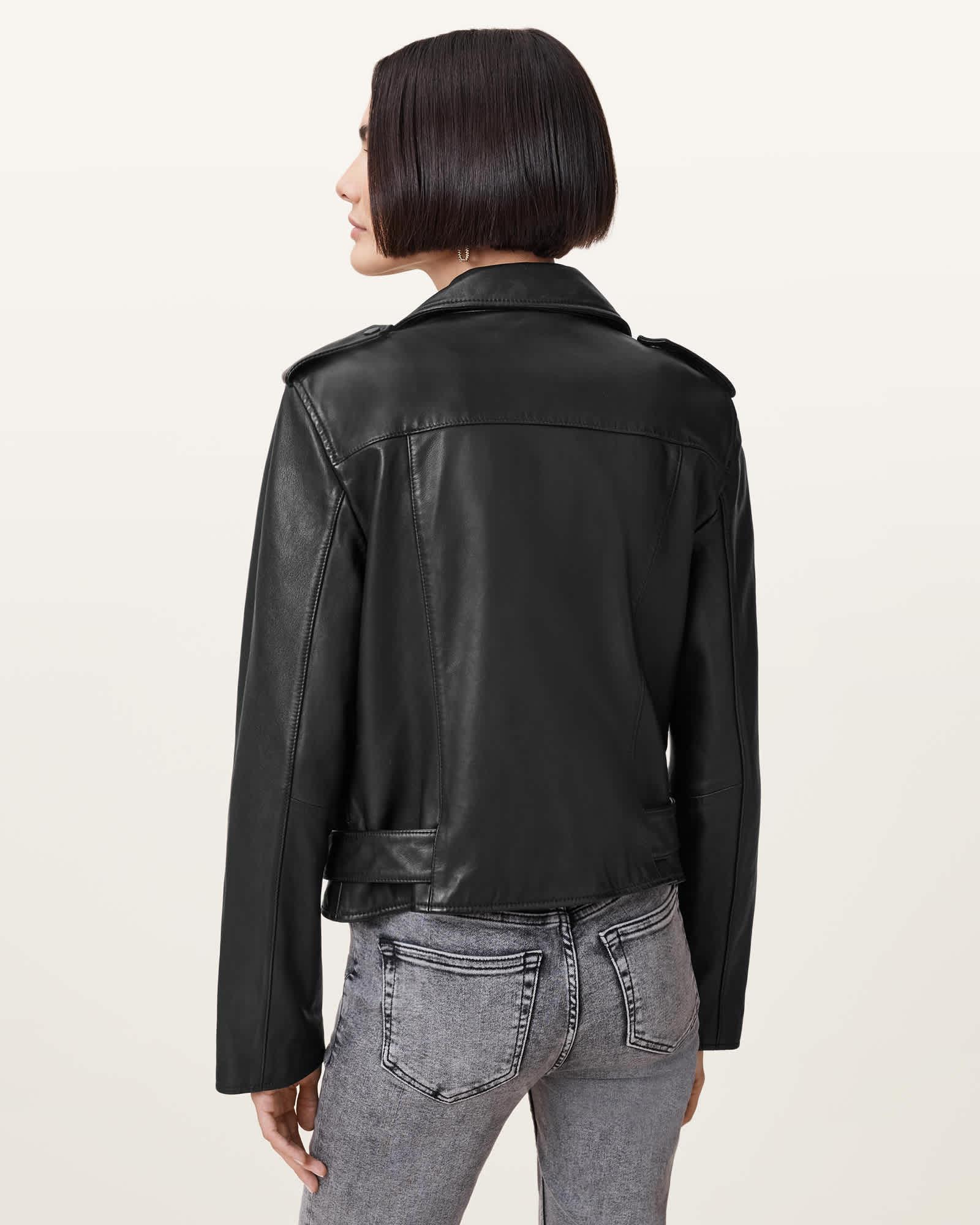 Motorcyclist or not, everyone needs a biker jacket in their wardrobe. This is the Balfern, an iconic style made from butter-soft leather, the kind that shapes to your body after each wear. The waist belt and metal hardware add to the classic aesthetic. The best bit? It goes with everything, day or night - adding attitude to your outfit has never been easier. This leather jacket is designed to a regular fit Long sleeve Metal hardware Three lower zip pockets Fully lined Belted hem with roller buckle fastening Bracelet length sleeves Zip cuff detail Epaulette shoulder detail with popper fastening
