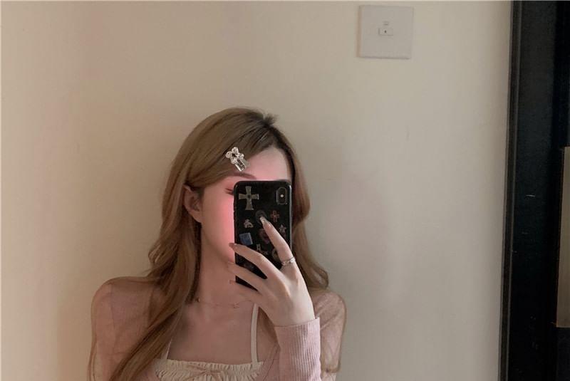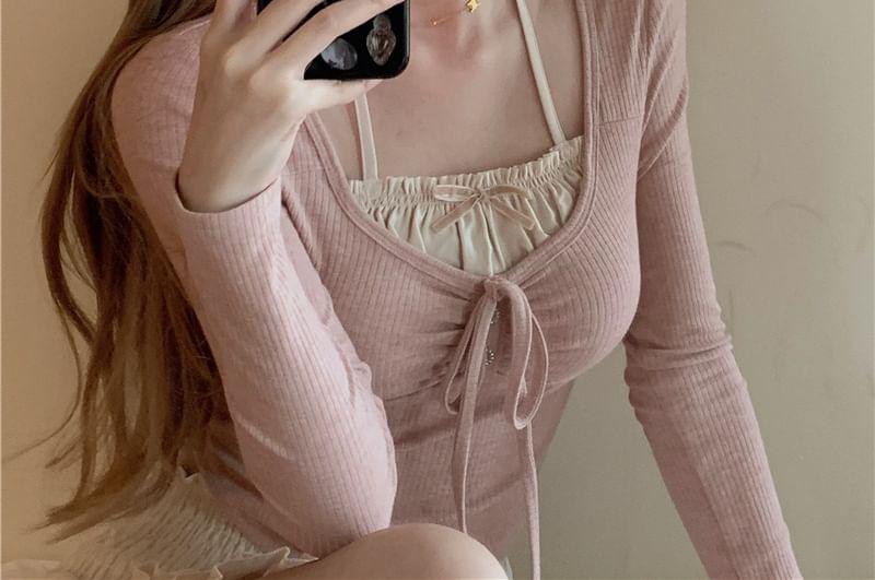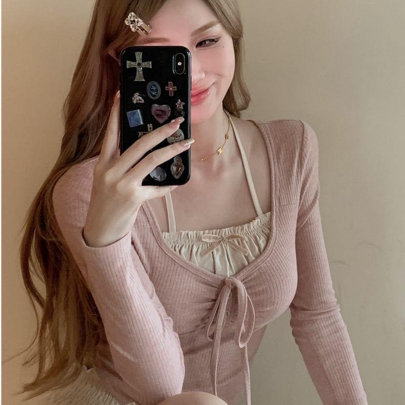 Balletcore Long-Sleeve Halter Bow Frill Mock Two Piece T-Shirt / High Waist Plain Tiered Mini A-Line Skirt