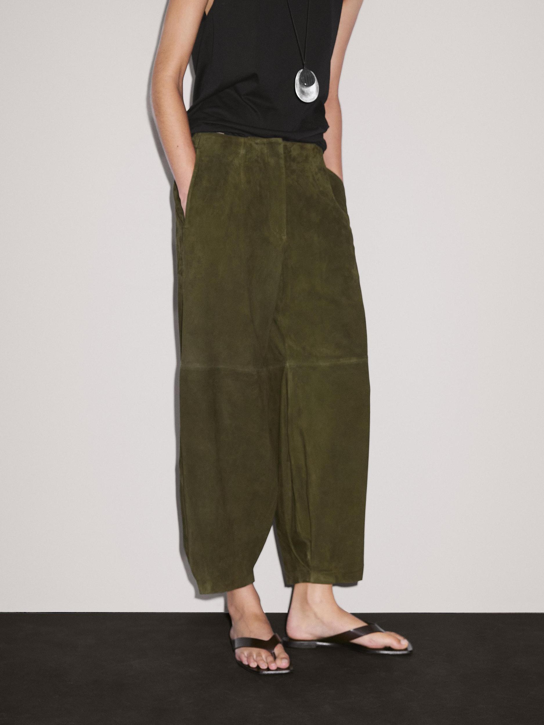 Balloon fit trousers: loose-fitting silhouette, wide leg volume and ankle fit, Concealed zip closure with buttoned placket, Two side pockets, Lined, Made of goatskin leather with suede finish