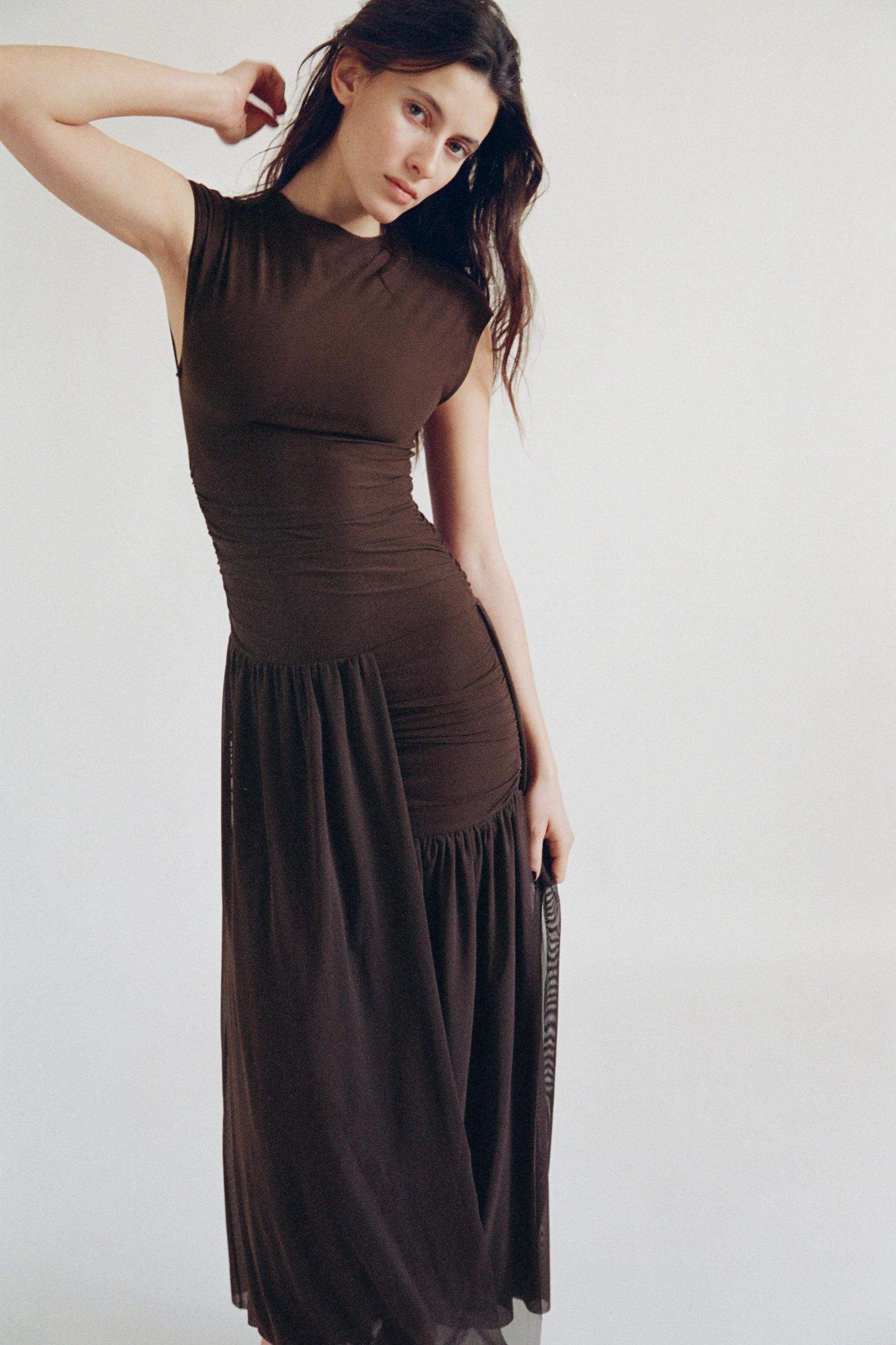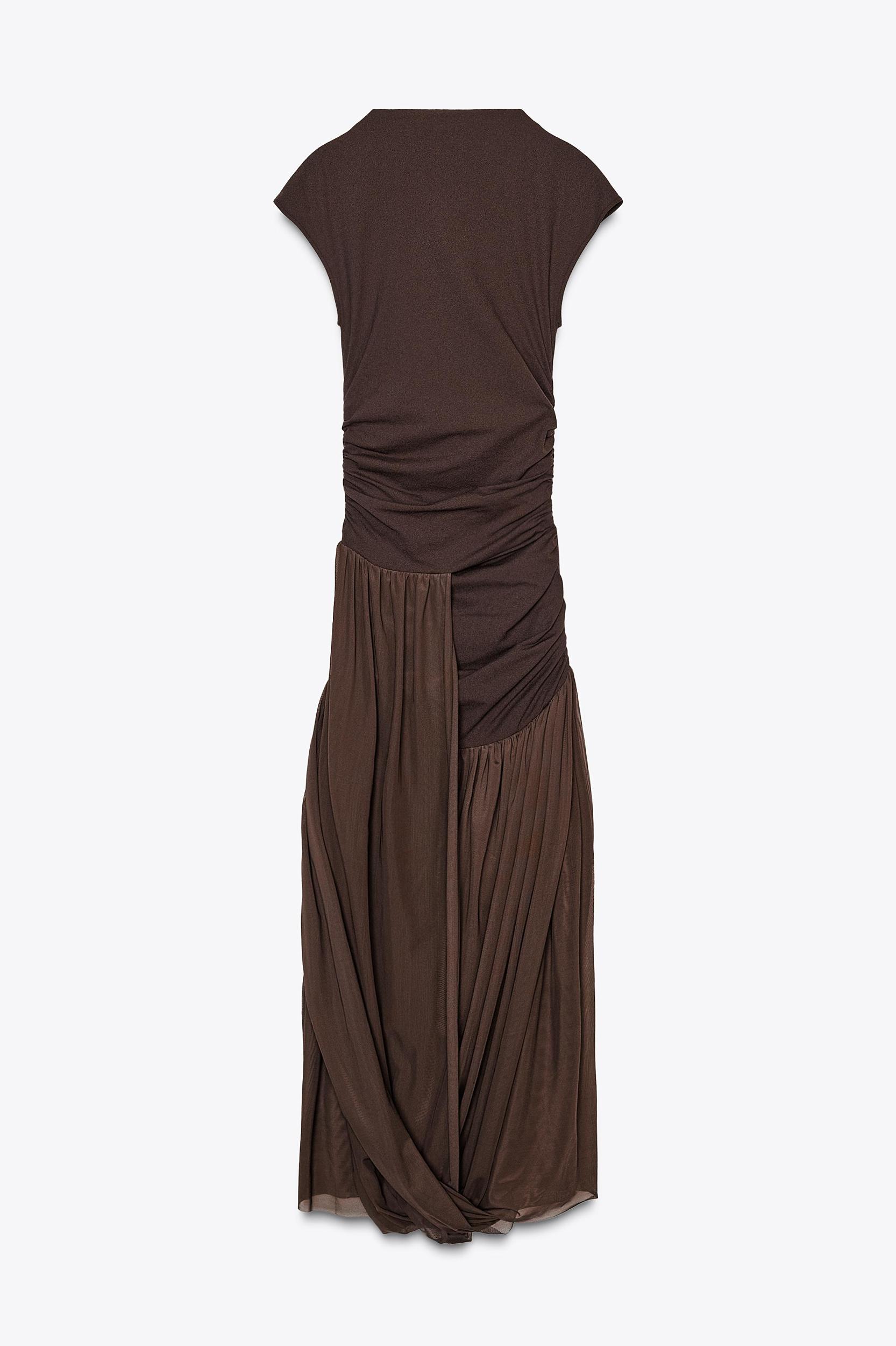 Midi dress with high neck and short sleeves. Combination fabric. Gathered detail at sides.