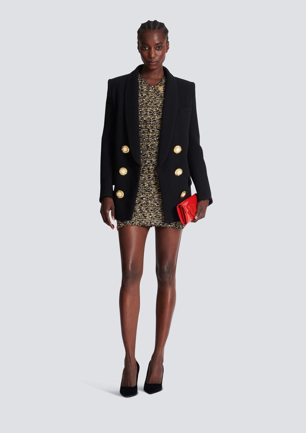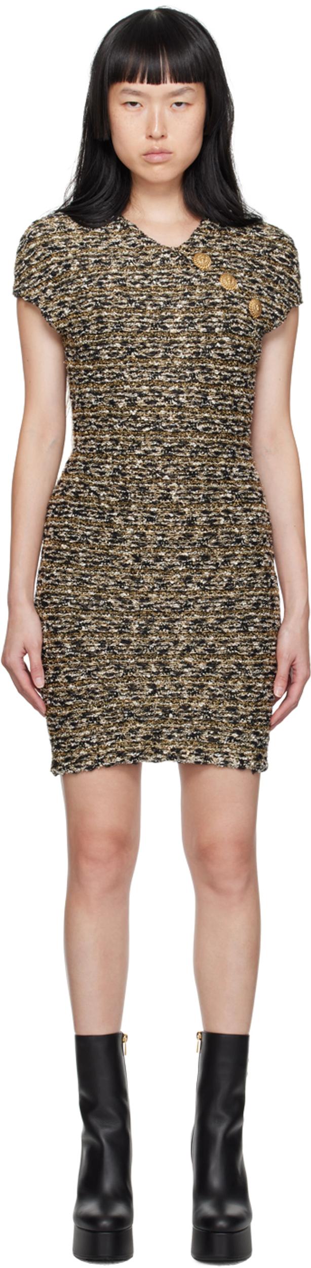 Shop Balmain Button-embellished Metallic Bouclé-tweed Mini Dress In Black Gold from 800+ stores, starting at $961. Tweed dress with lurex inserts, mini model with short sleeves, V-neck and gold logo button detail.. Colours. : Multicolor. Composition. : 48% vi 18% pl 15% pa 10% co 5% wv 3% me. Made in. : France. Dimension. : true to size fitFrench size. MPN. : BF0R6024KF16EAD. .